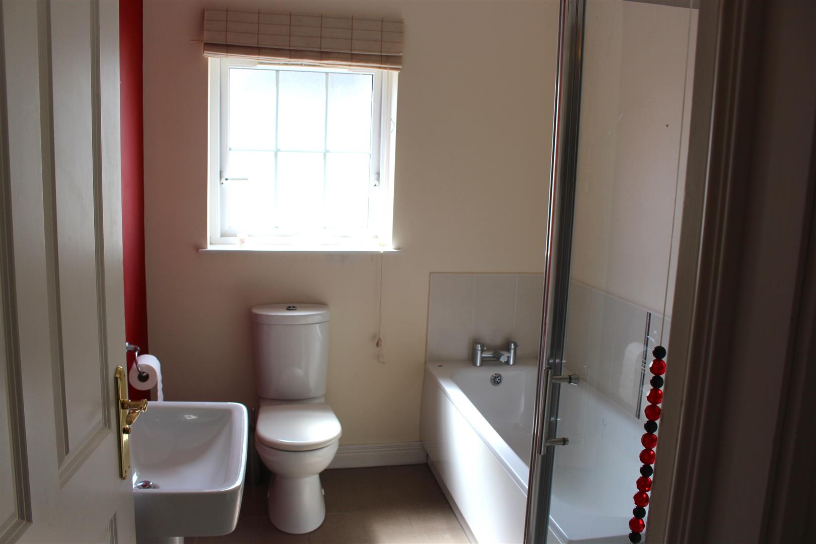 White bath. Fully tiled shower cubicle with electric red ring shower. Wall mounted wash hand basin. Extractor fan. Chrome heated towel rail.