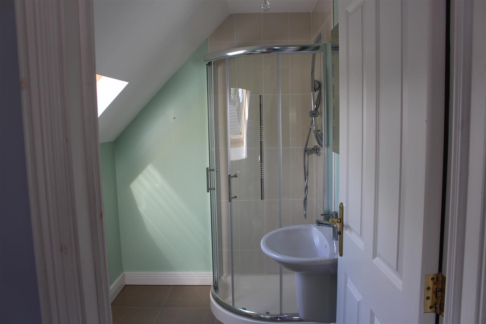 Fully tiled shower cubicle with power shower. Low Flush W.C. Wall mounted wash hand basin. Extractor fan. Tiled flooring.