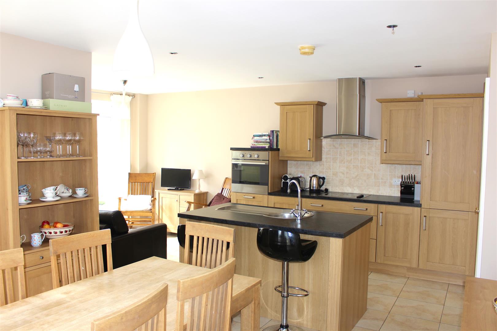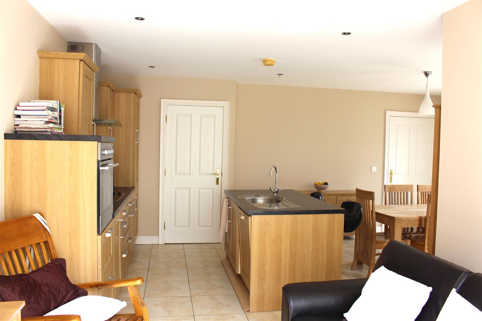 With a range of eye and low level units with matching worktop. Centre island with stainless steel bowl sink unit and breakfast bar. Tiled around units. Under unit lighting. Built in hob and oven. Extractor fan and light. Built in fridge freezer. Built in dish washer. Tiled flooring.