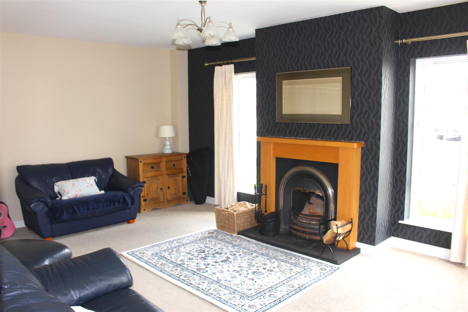 Maple effect fireplace with cast iron inset and tiled hearth. Carpet flooring.