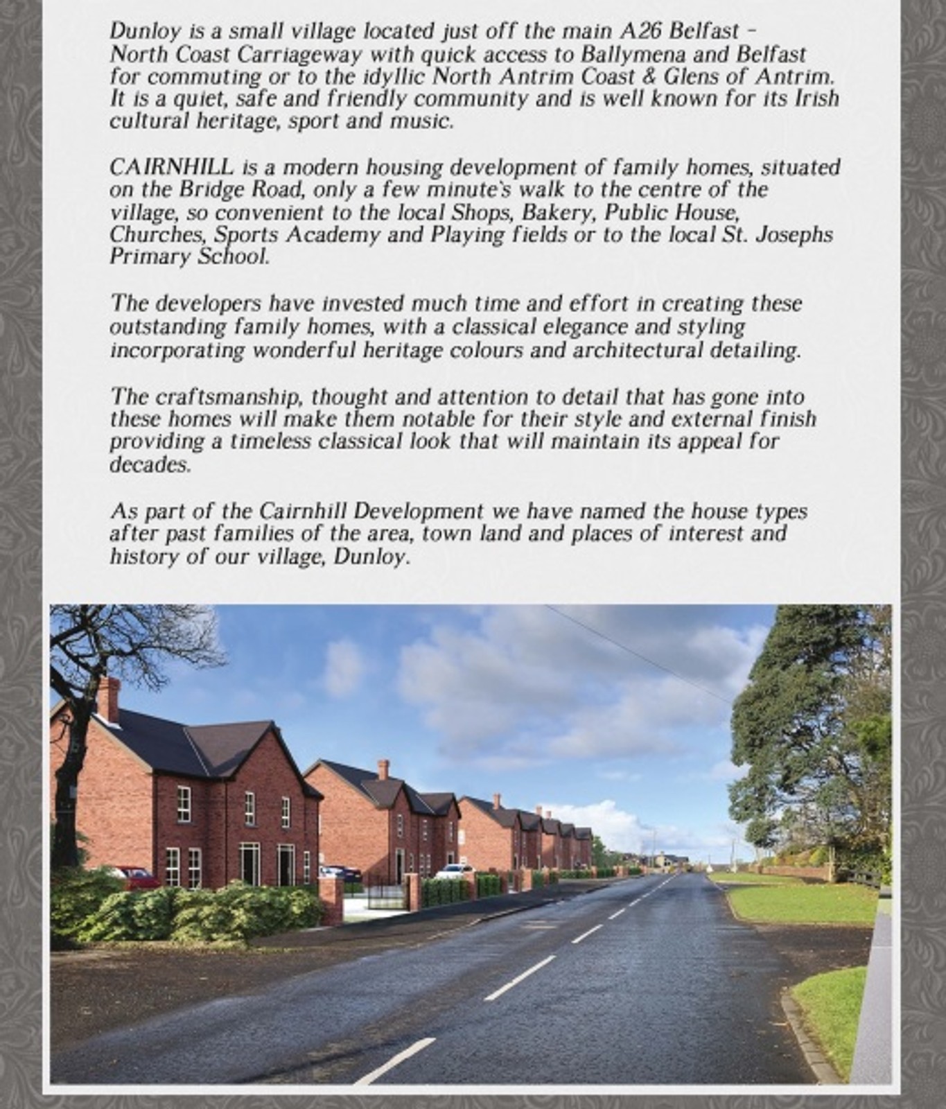 Dunloy itself is a small village with a great sense of community and only a short drive to the A26 Frosses Road providing ease of access for commuting to Ballymena/Belfast or visiting all the attractions/facilities on the famous Causeway Coast.