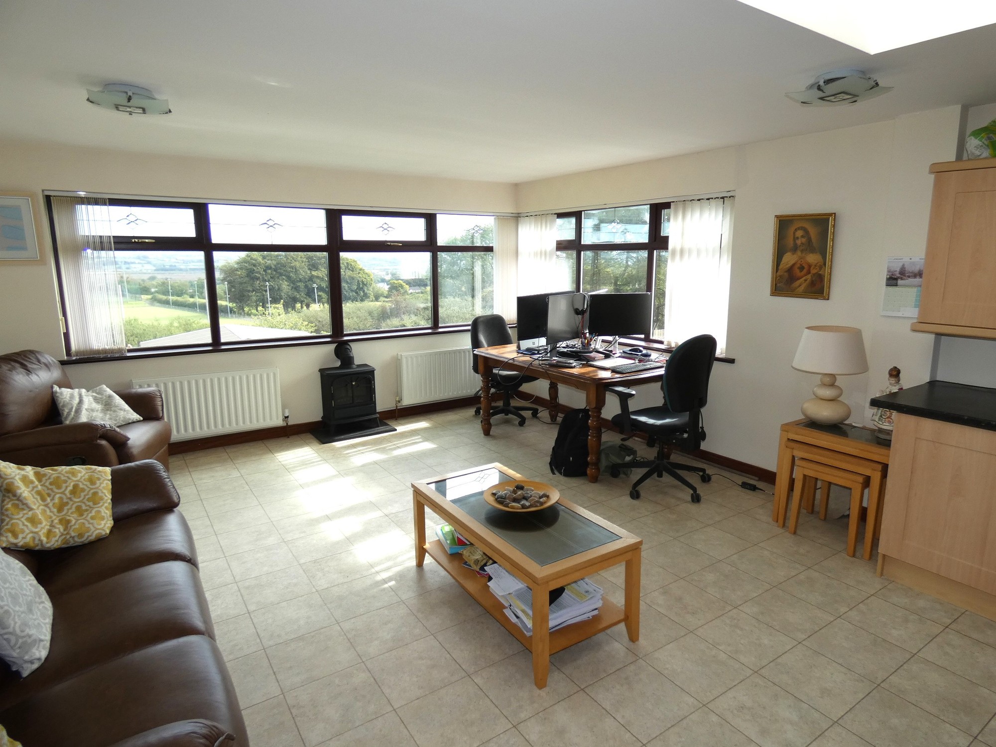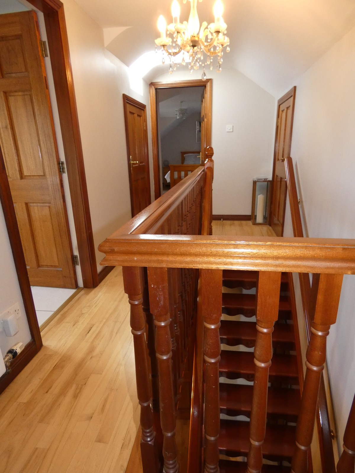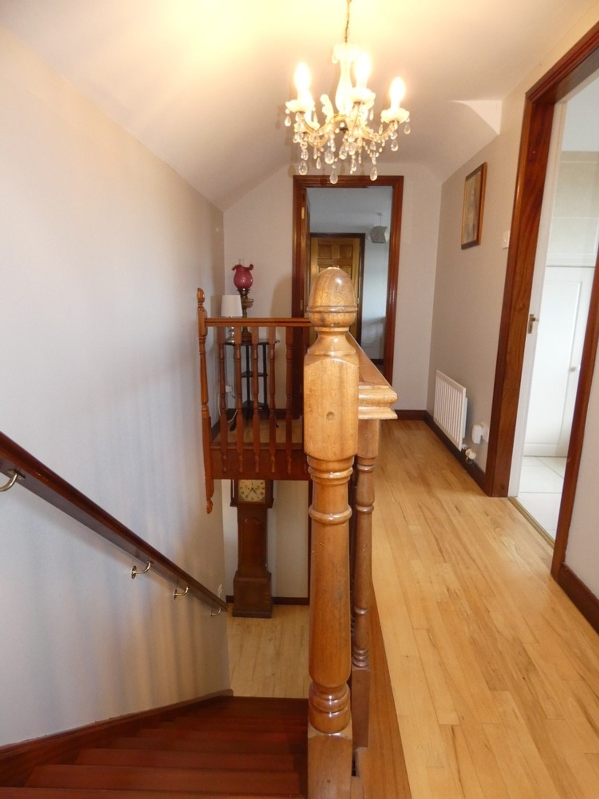 Maple wooden floor, open tread staircase to first floor, hot press with shelving, pedestrian door to Annexe, mahogany effect upvc front door with side panels.