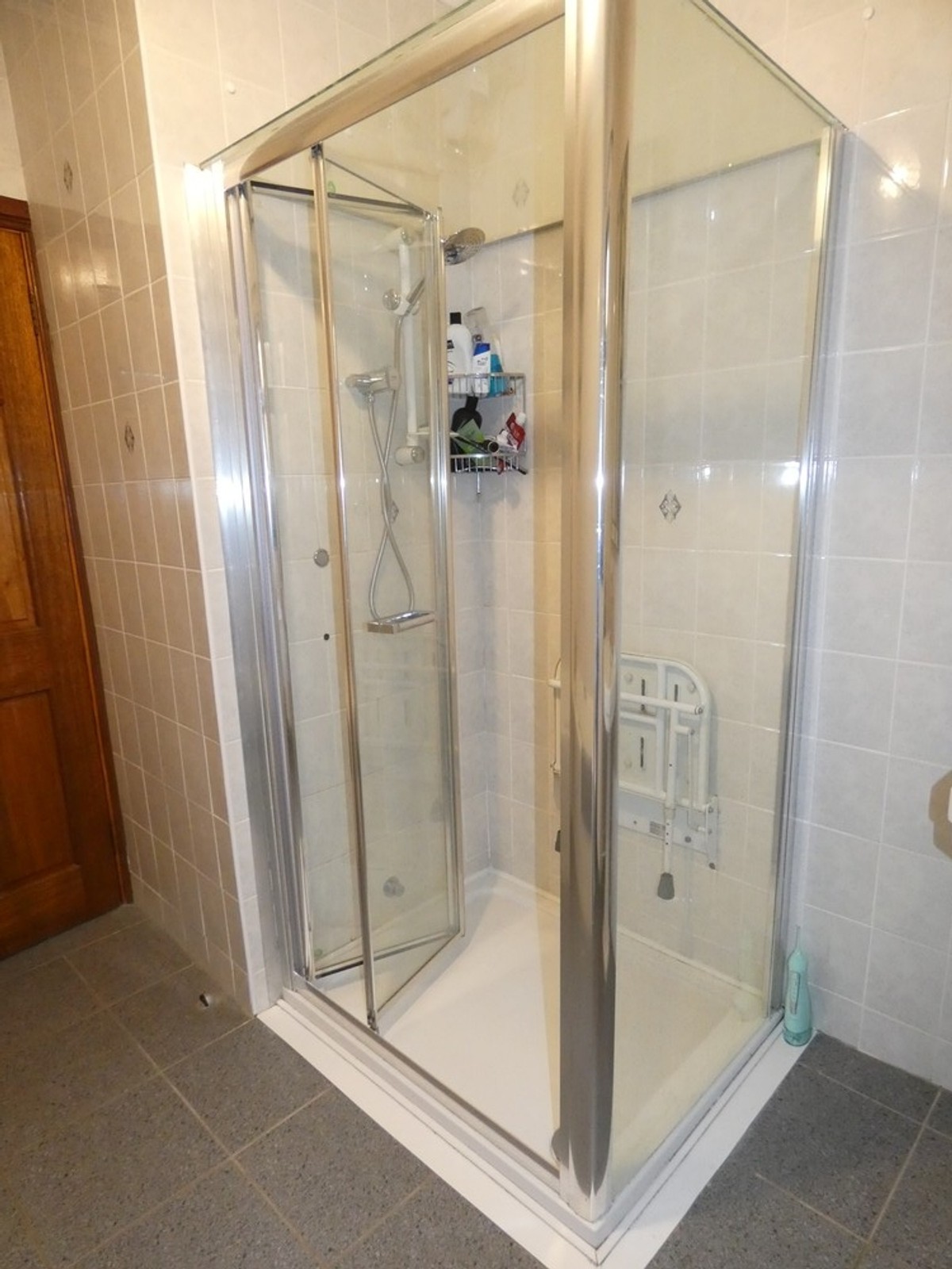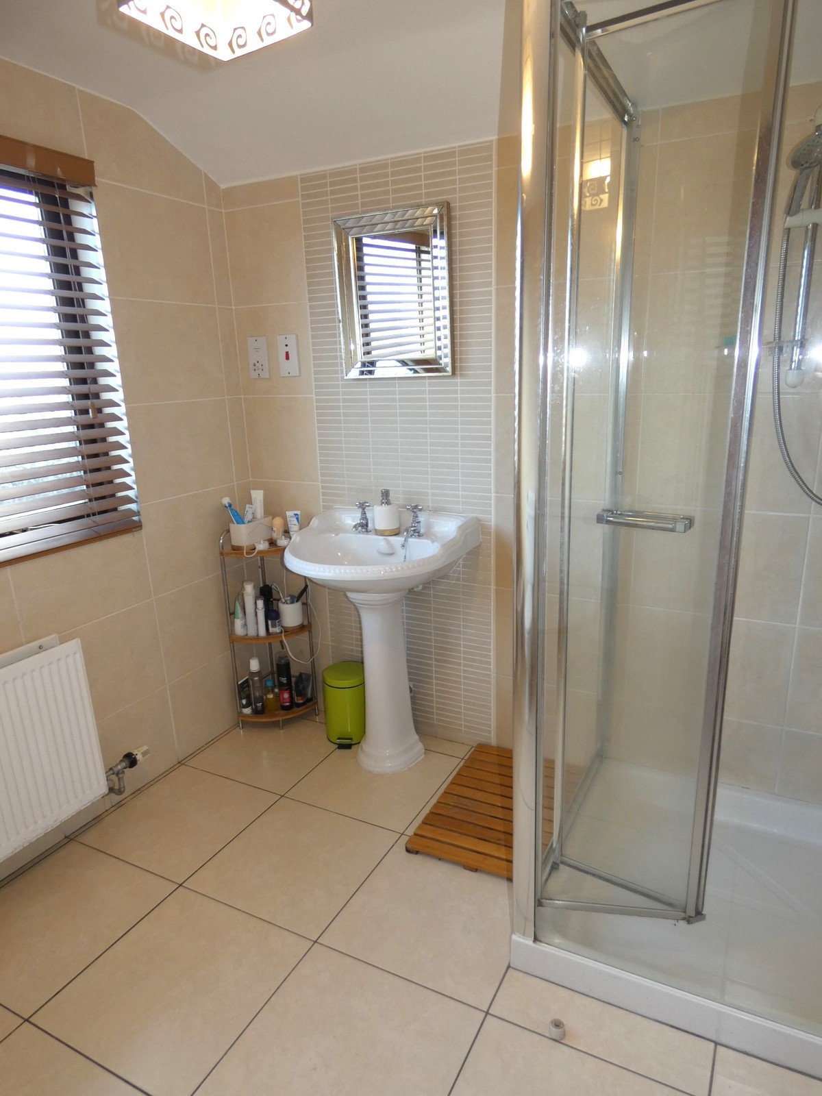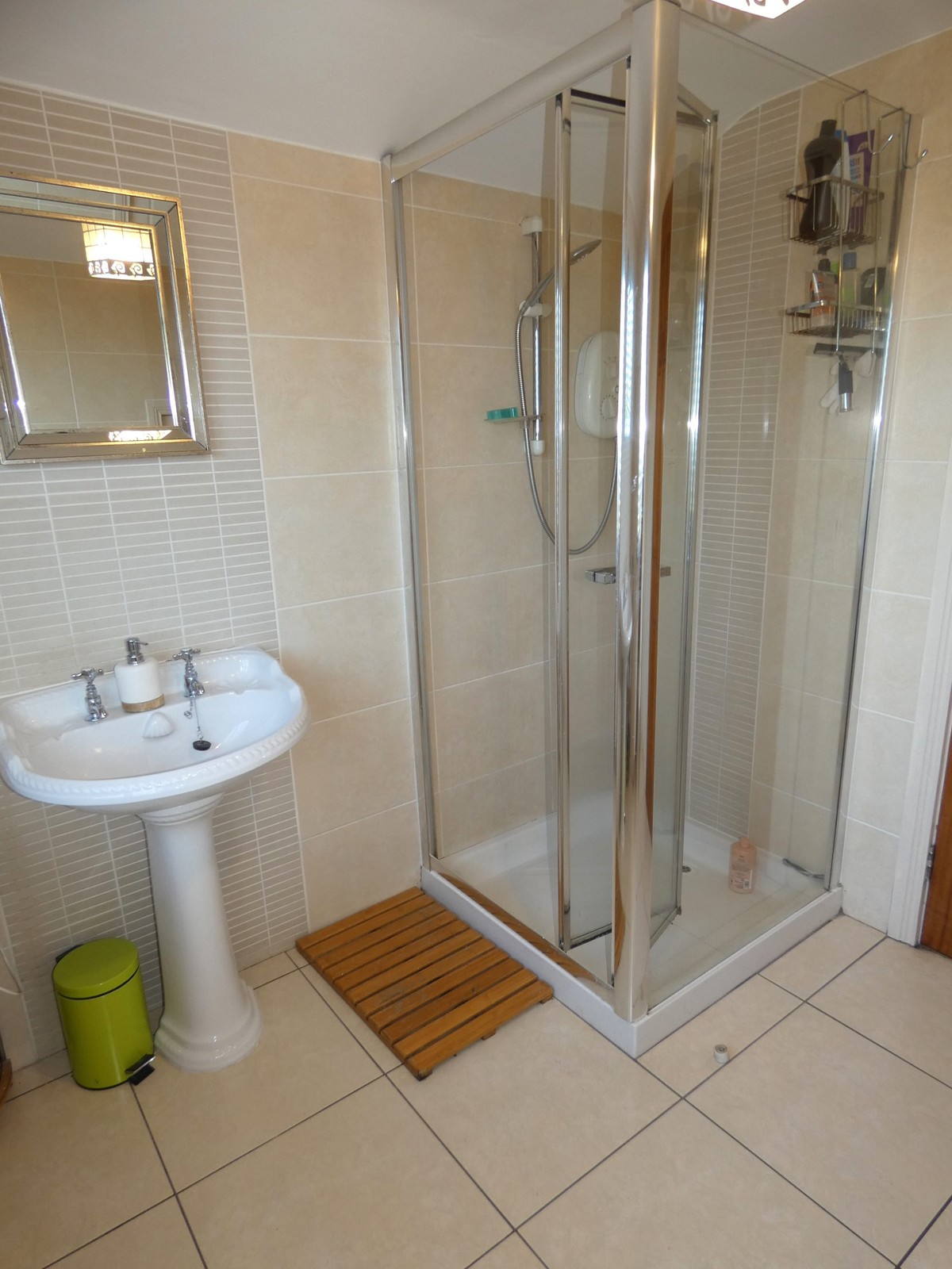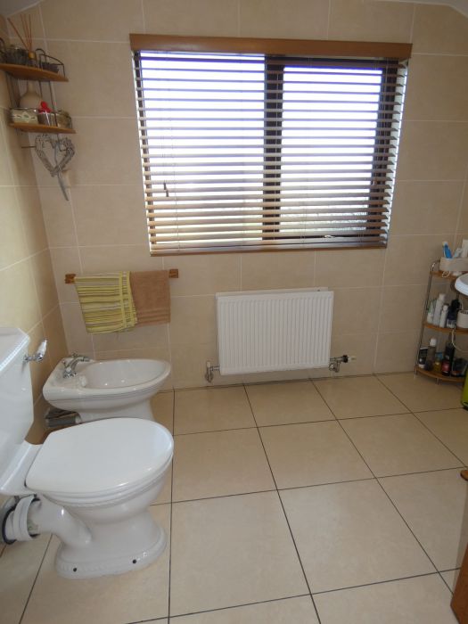 With Mira electric shower, tiled cubicle, wc, bidet, wash hand basin, tiled walls, tiled floor, shaver point, extractor fan, storage cupboard.