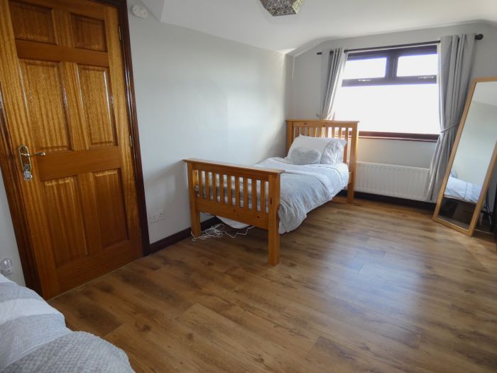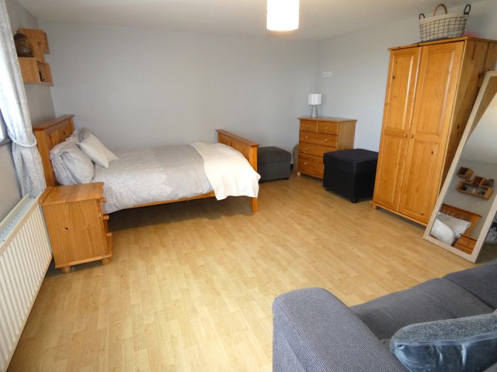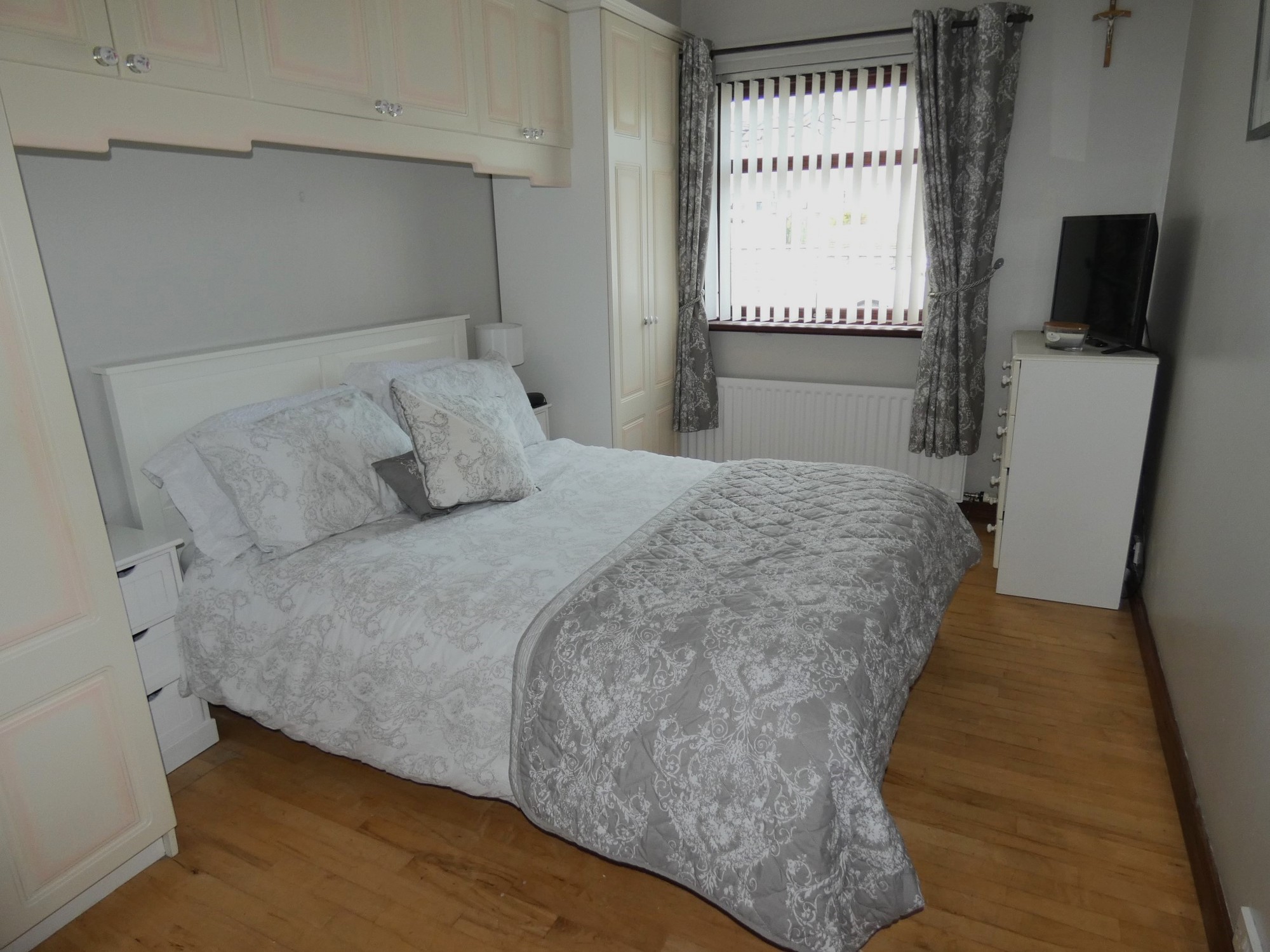 With wood laminate flooring, 2 x accesses to eaves storage, telephone point, Ensuite Bathroom with bath, wc, wash hand basin with storage cupboard below, tiled floor, tiled walls, access to eaves storage, extractor fan, shaver point.