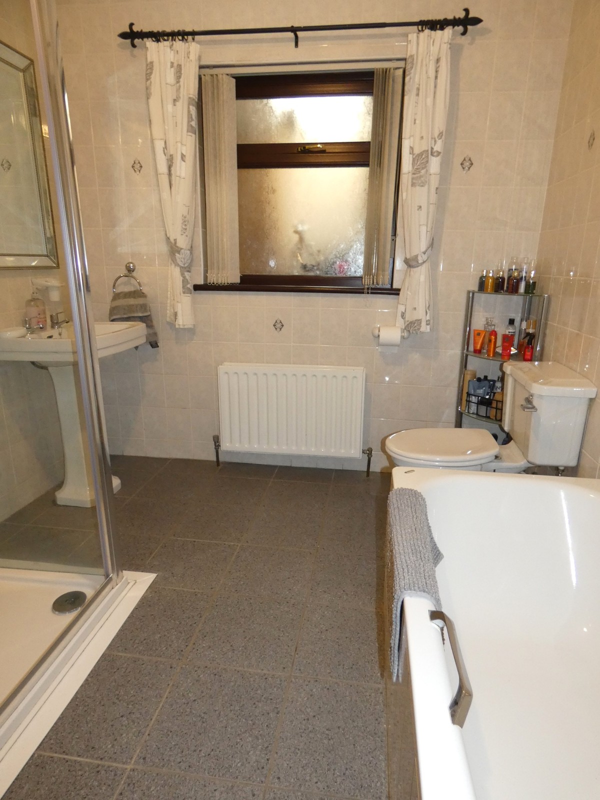 With fitted suite including thermostatic shower, tiled cubicle, bath with telephone hand shower, wc, wash hand basin, tiled walls, tiled floor, wooden sheeted ceiling, shaver point, extractor fan.