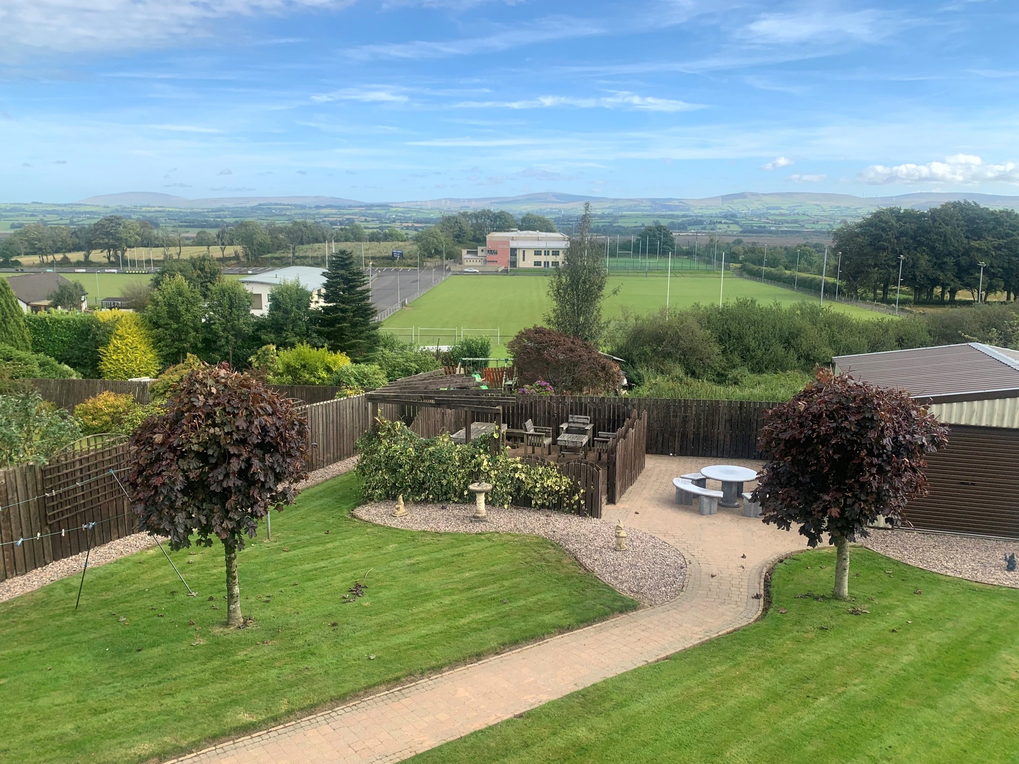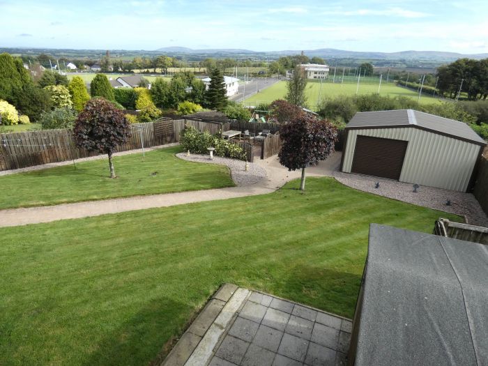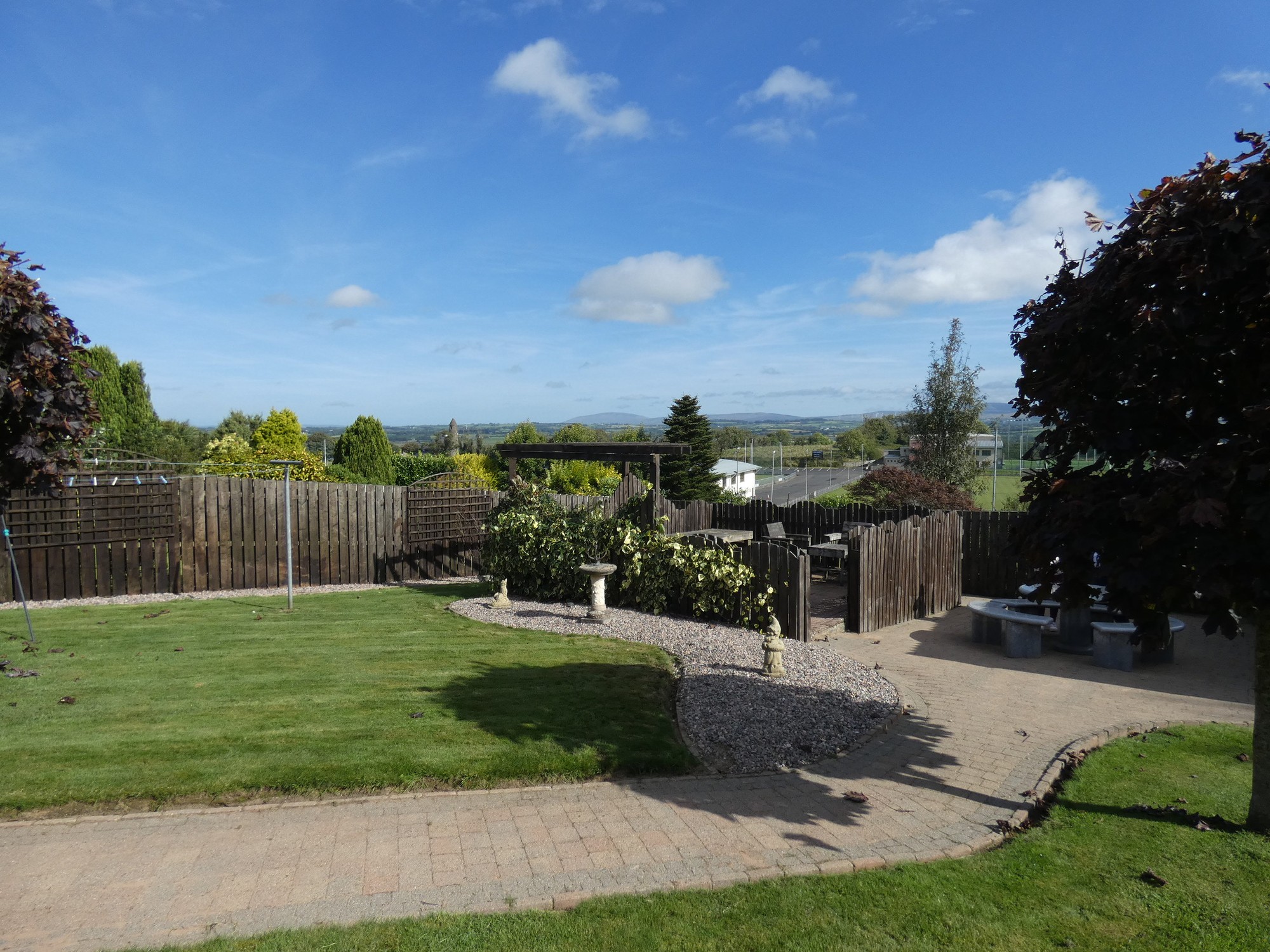 Landscaped garden area to rear of property partly in lawn with copper beach style trees and patio area.