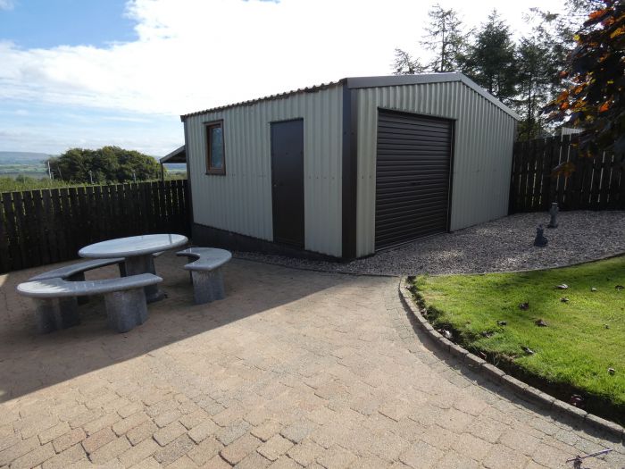 Wooden construction, metal roof, paved flooring, pedestrian gate to rear of property.