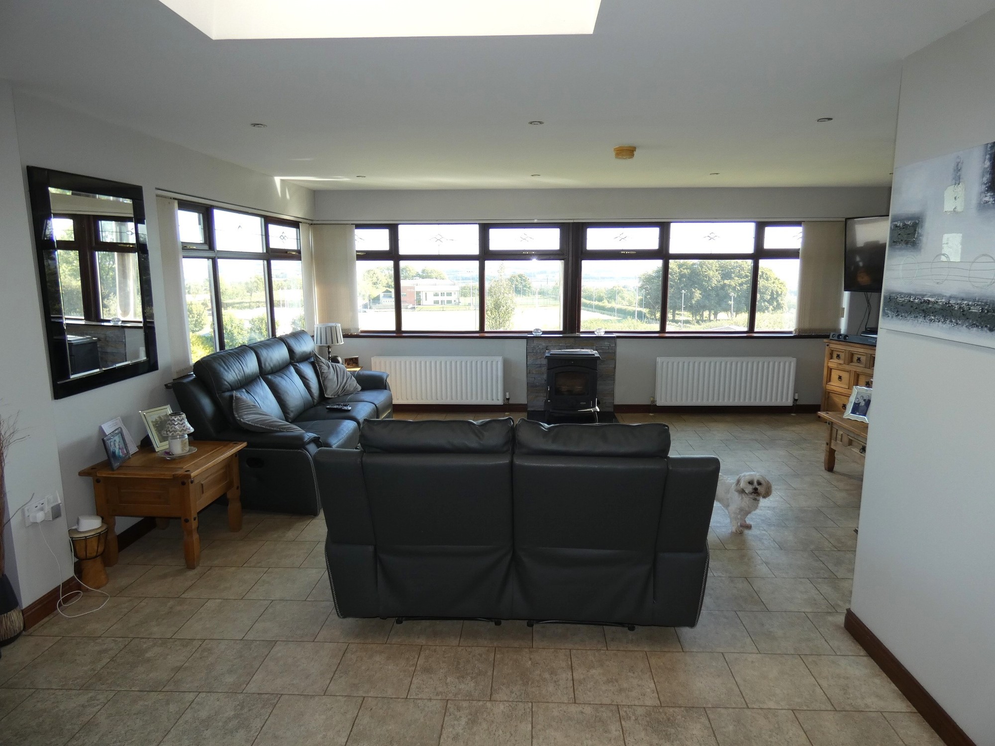 With feature extended corner windows with picturesque elevated views, multifuel stove with decorative tiling, granite hearth and granite shelf, ceiling downlights, velux skylight, Karndean flooring, staircase to lower floor.