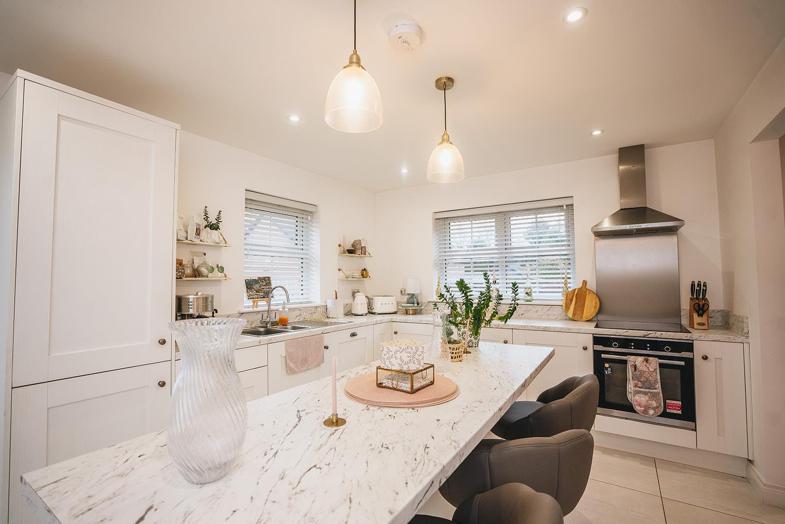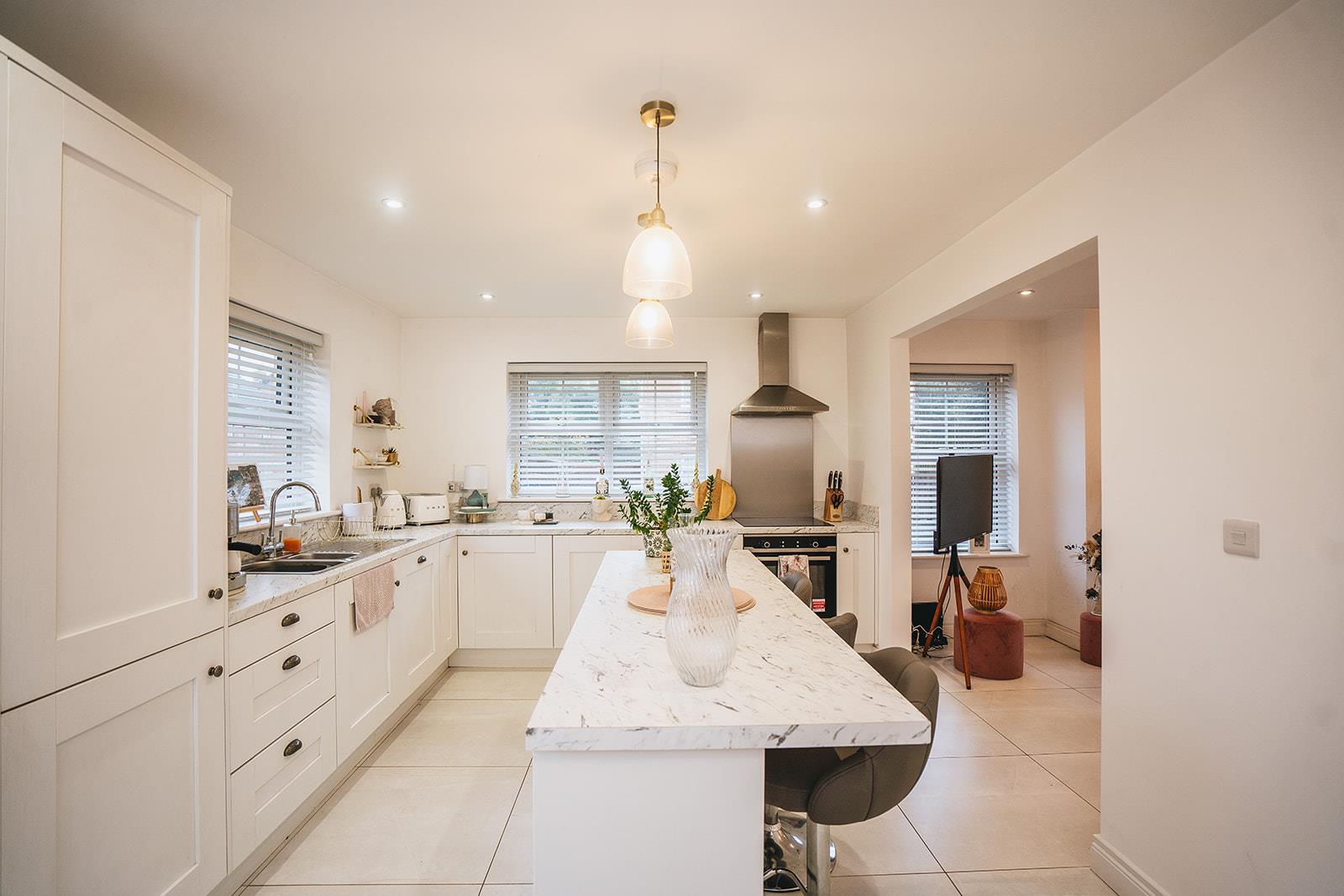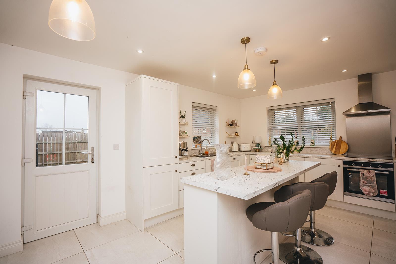 Stunning modern kitchen comprising a range of high and low units, laminated worksurface with upstand and 1 1/2 bowl stainless steel sink inset, induction hob with stainless steel splashback and extractor canopy. Electric under oven, integrated dishwasher, integrated fridge freezer and centre island with storage cupboards and breakfast bar. Utility items concealed in matching housing with space for tumble dryer and plumbed for washing machine along with storage shelves and larder cupboard.