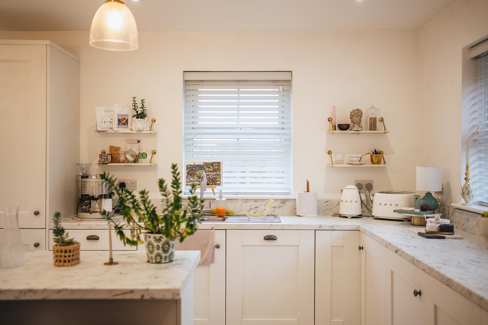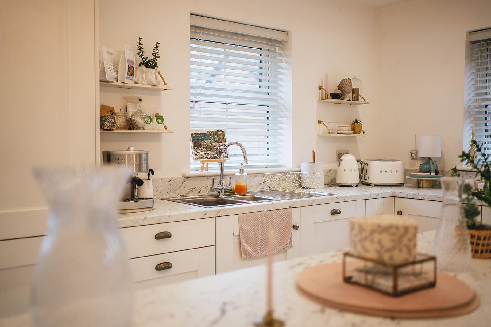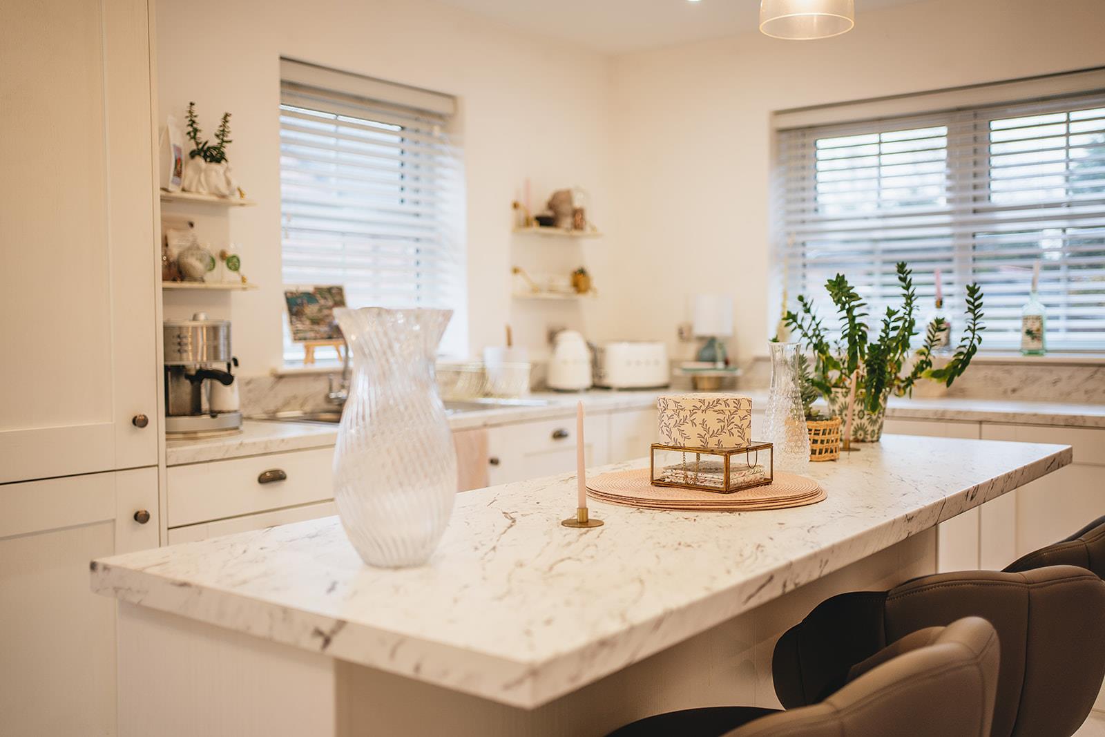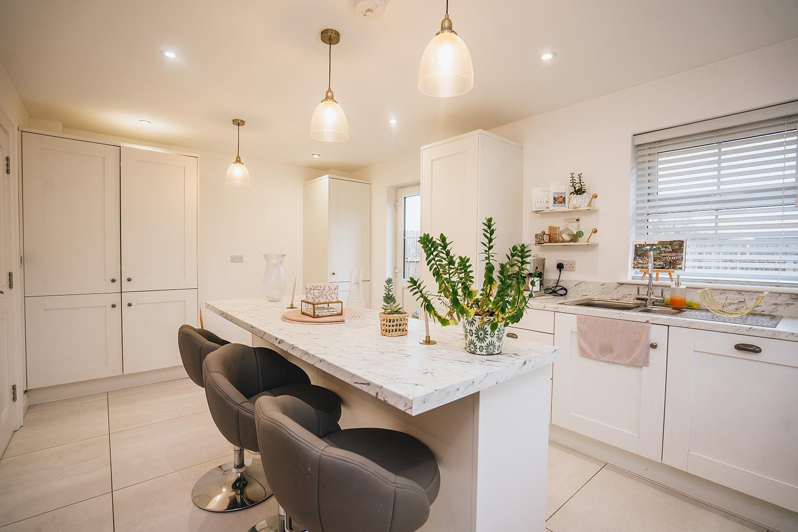 Stunning modern kitchen comprising a range of high and low units, laminated worksurface with upstand and 1 1/2 bowl stainless steel sink inset, induction hob with stainless steel splashback and extractor canopy. Electric under oven, integrated dishwasher, integrated fridge freezer and centre island with storage cupboards and breakfast bar. Utility items concealed in matching housing with space for tumble dryer and plumbed for washing machine along with storage shelves and larder cupboard.