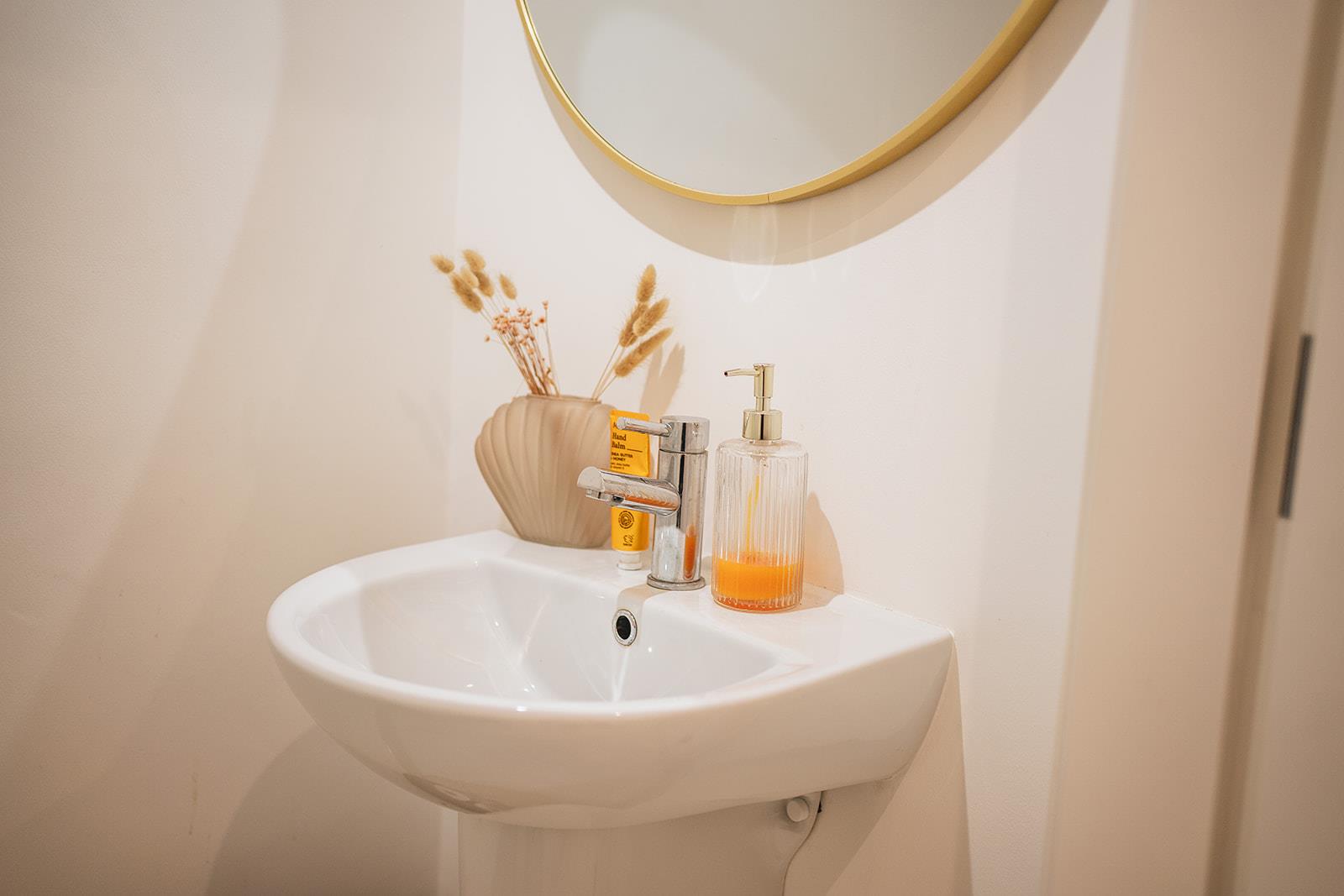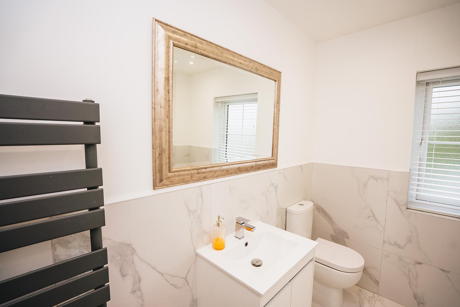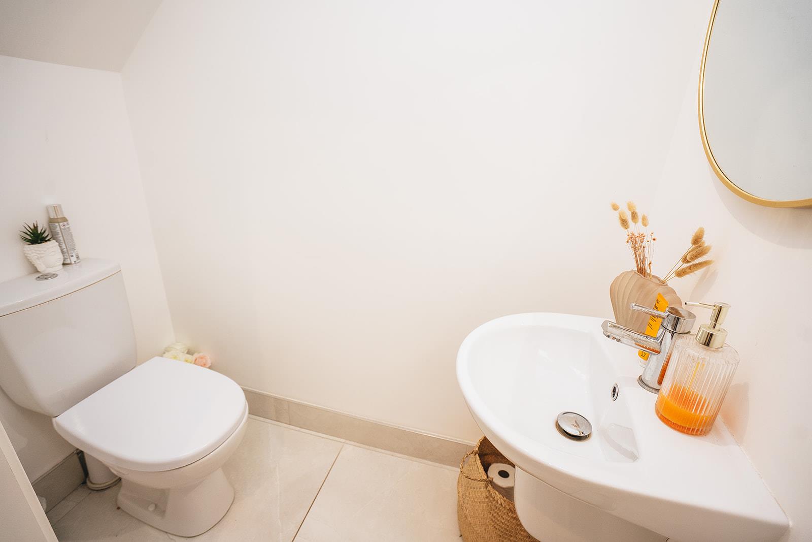 A black uPVC double glazed entrance door leads to the reception hall with tiled floor and low voltage spotlighting. Sep WC comprising low flush wc, wall hung wash hand basin with mixer tap, low voltage spotlighting and tiled floor.