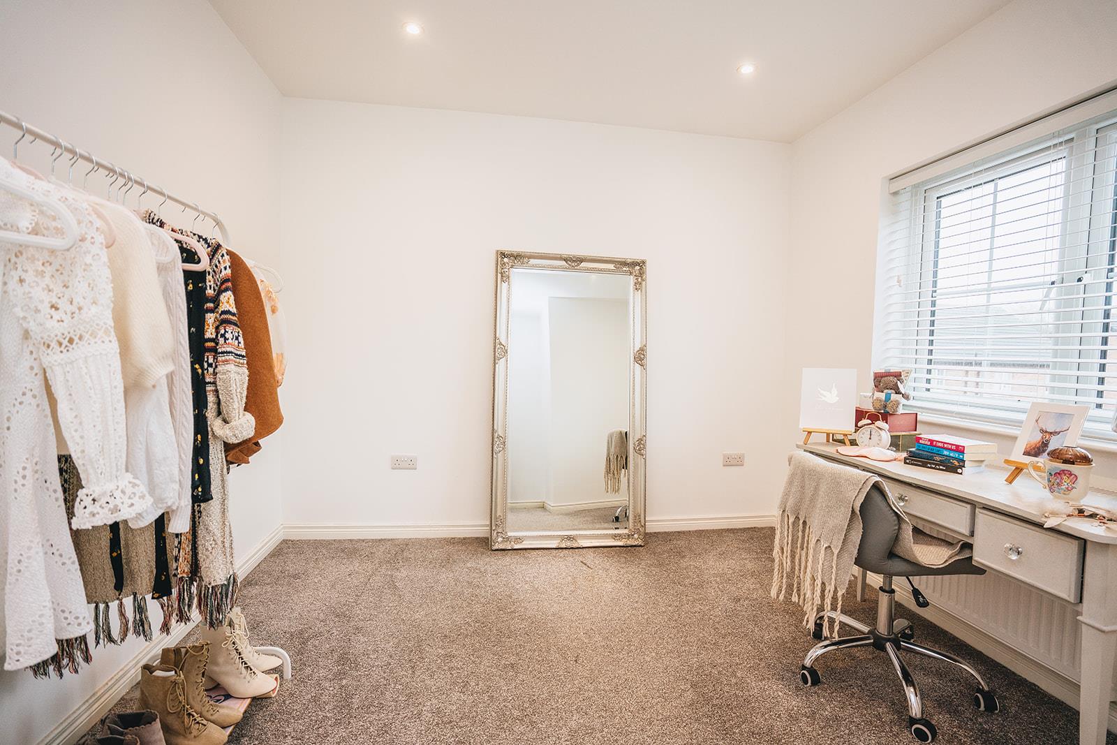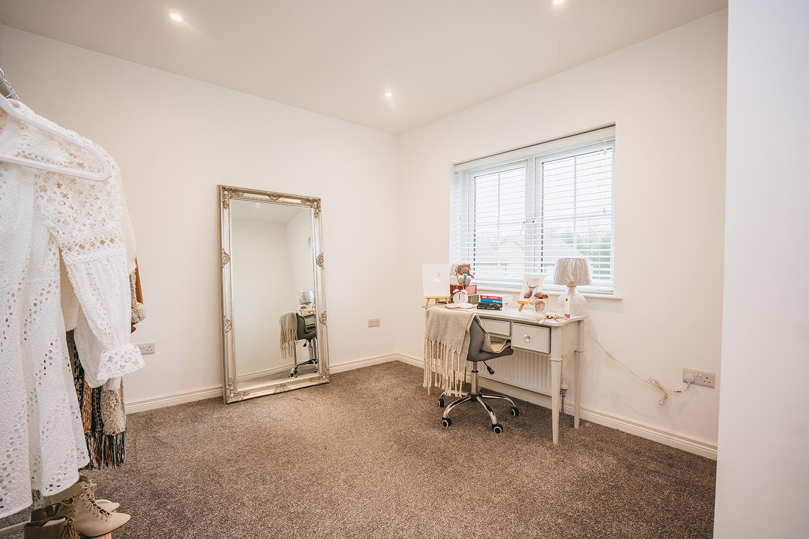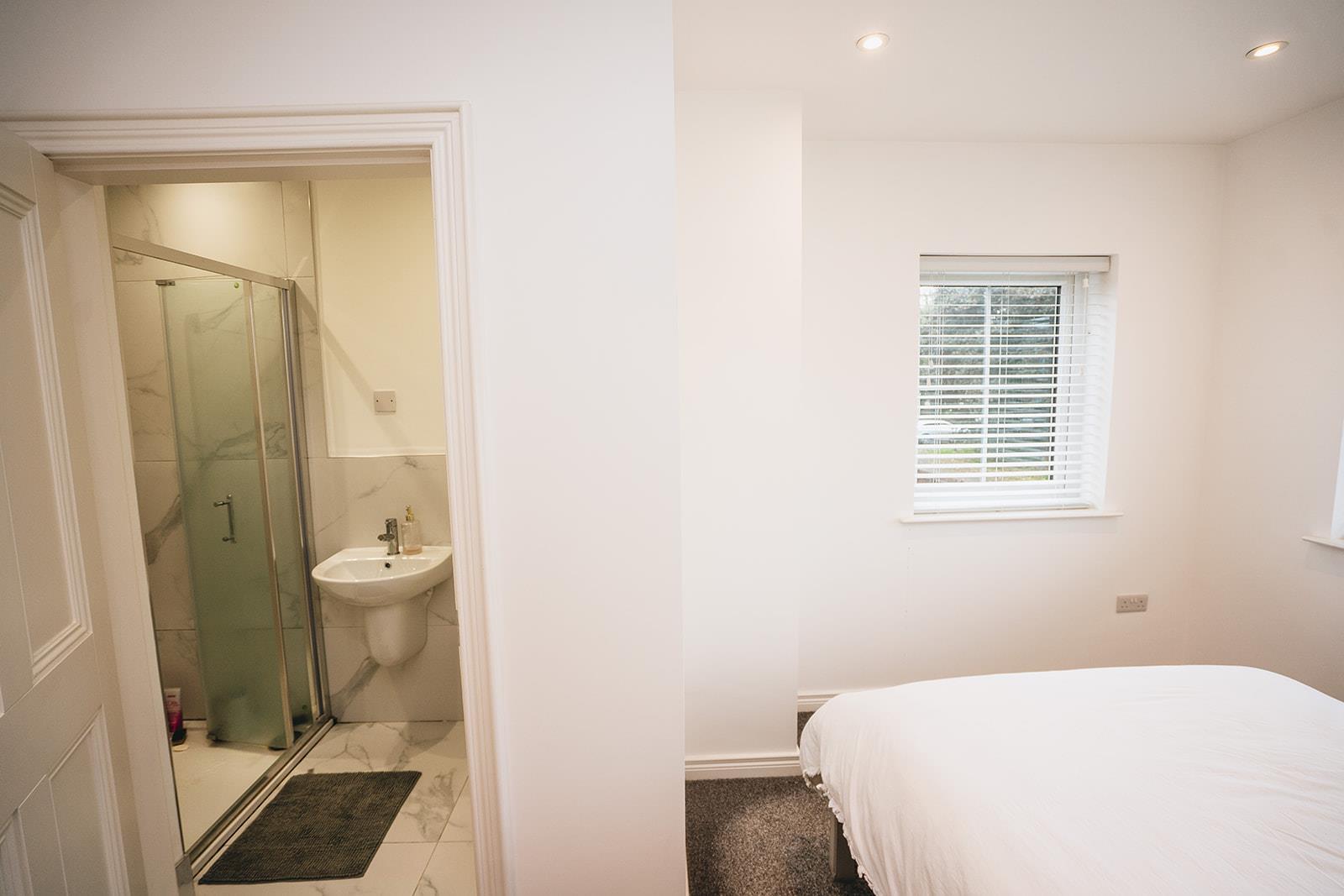 A double room with dual aspect windows. En-Suite 2.2m x 1.1m comprising wall hung wash hand basin with mixer tap, low flush wc, low voltage spotlighting, part tiled walls, tiled floor and tiled shower cubicle with rainfall shower head, telephone hand shower and thermostatic wall controls.