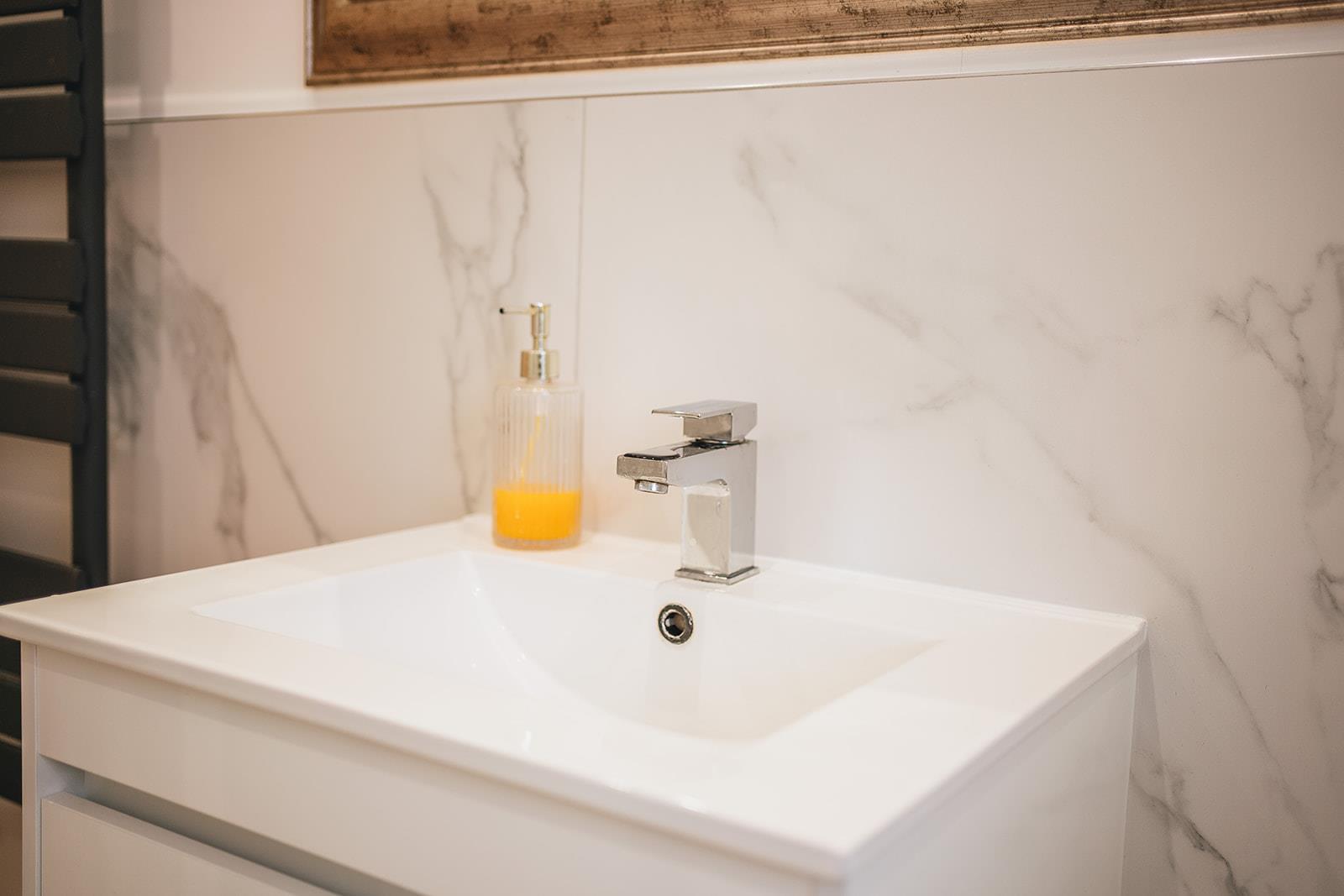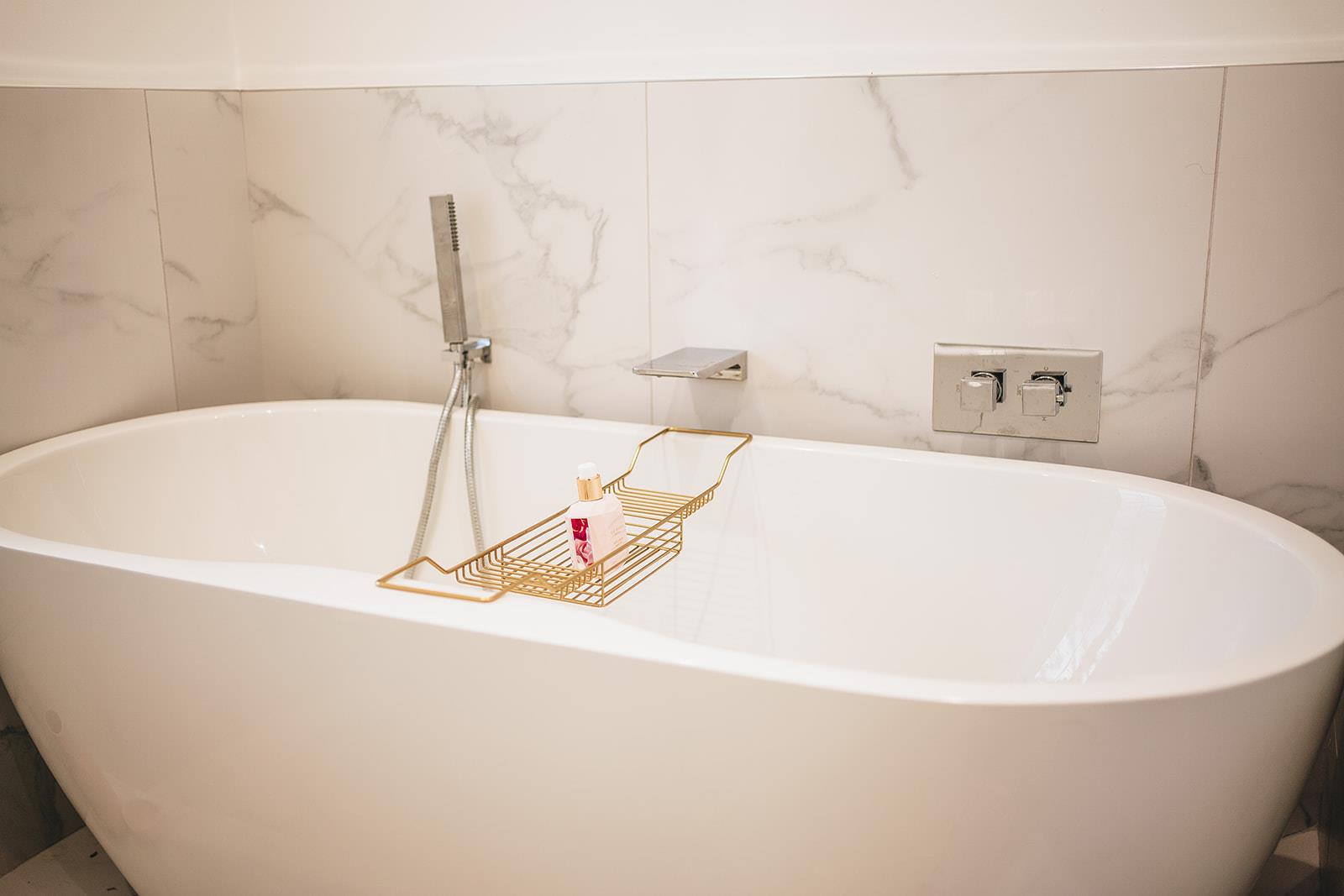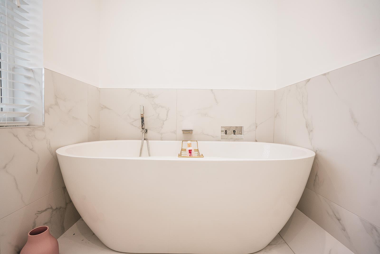 Family bathroom comprising a freestanding bath with rainfall tap, telephone hand shower and wall controls, low flush wc, vanity basin with mixer tap, part tiled walls, tiled floor, heated towel rail, low voltage spotlighting and separate shelved airing cupboard with light.