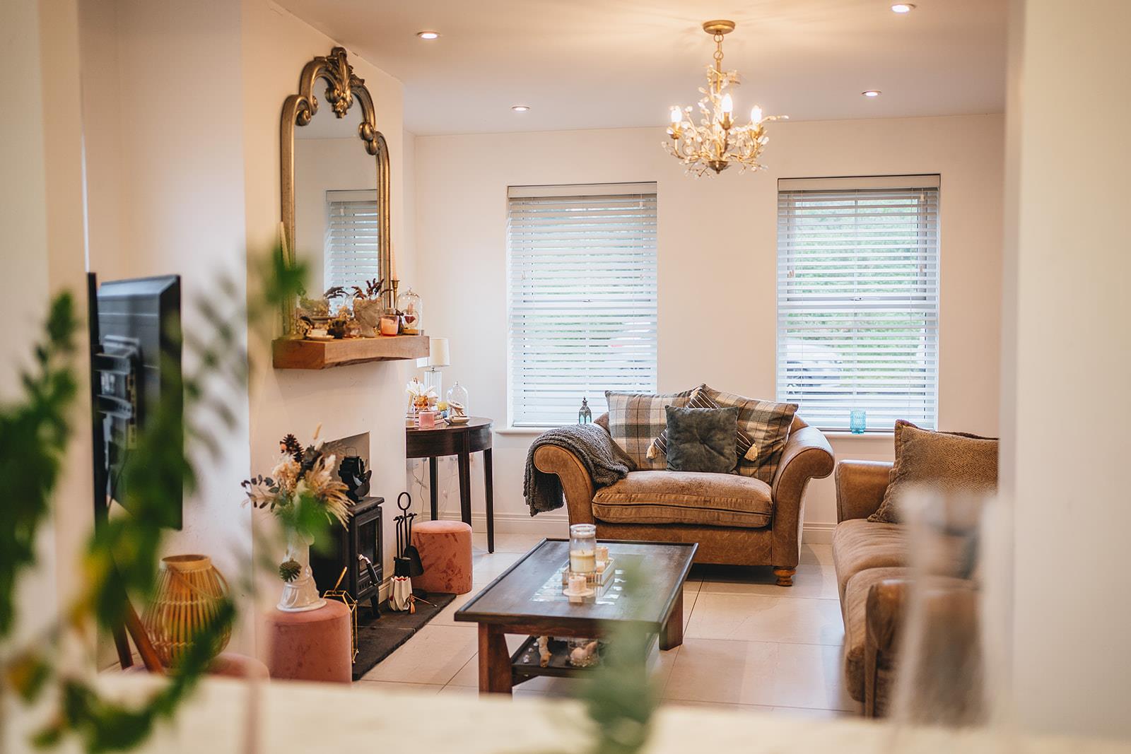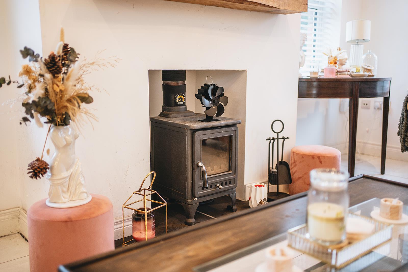 A bright living space with a wood burning stove on a slate hearth with wooden overmantel, tiled floor, low voltage spotlighting and open plan to:
