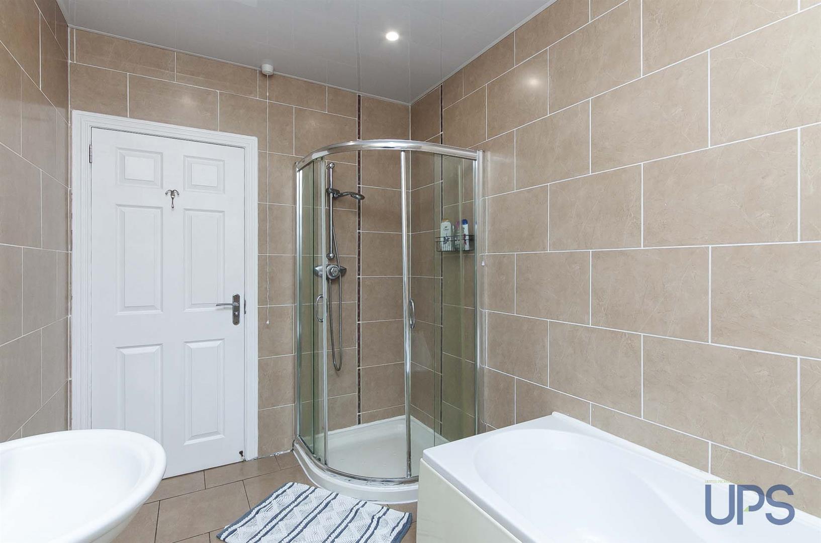 Bath, separate shower cubicle, thermostatically controlled shower unit, pedestal wash hand basin, chrome effect sanitary ware, extractor fan, spotlights, beautiful tiled walls and floor.