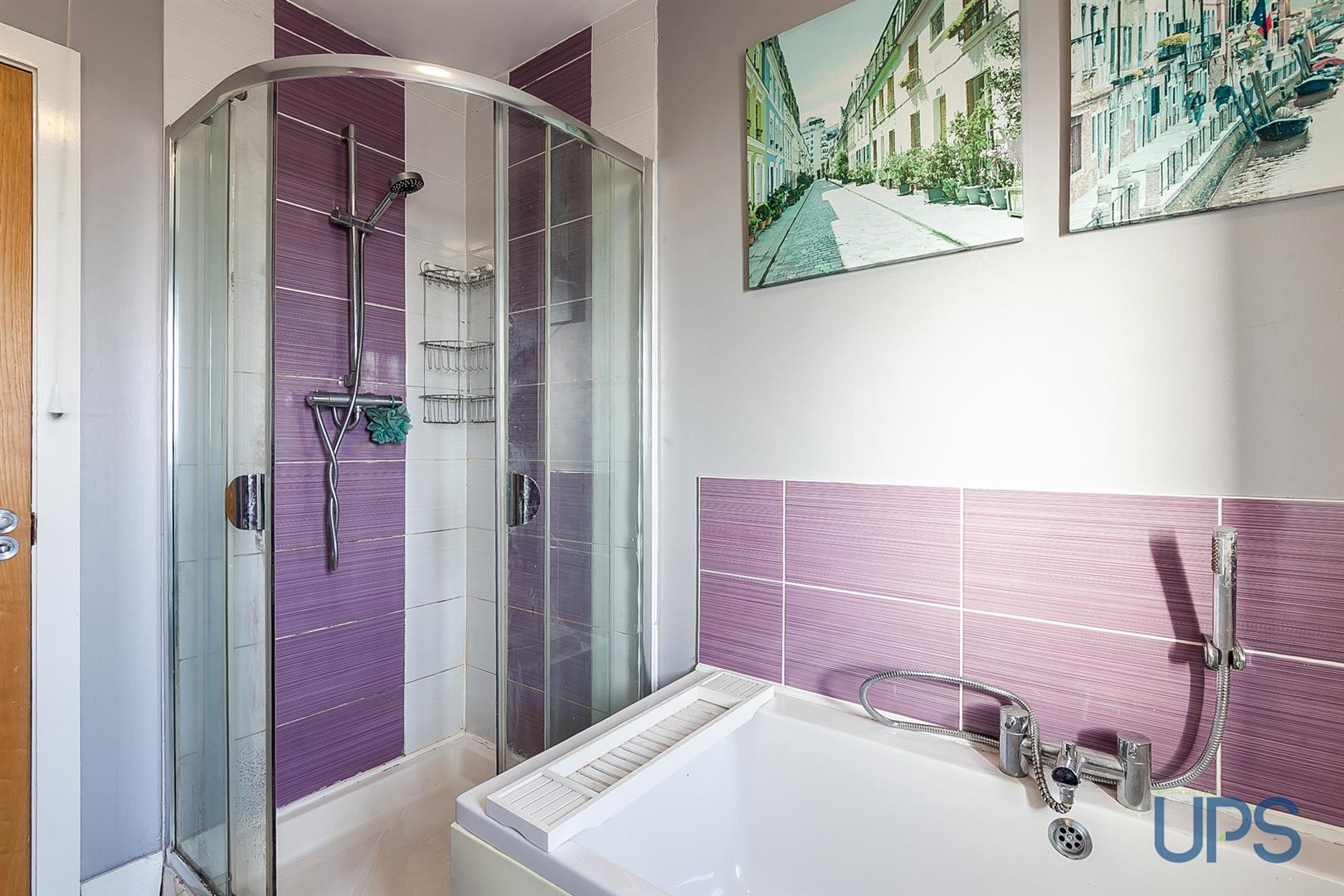 Paneled bath, telephone hand shower, shower cubicle, thermostatically controlled shower unit, low flush W.C, pedestal wash hand basin, chrome effect towel warmer, tiling.