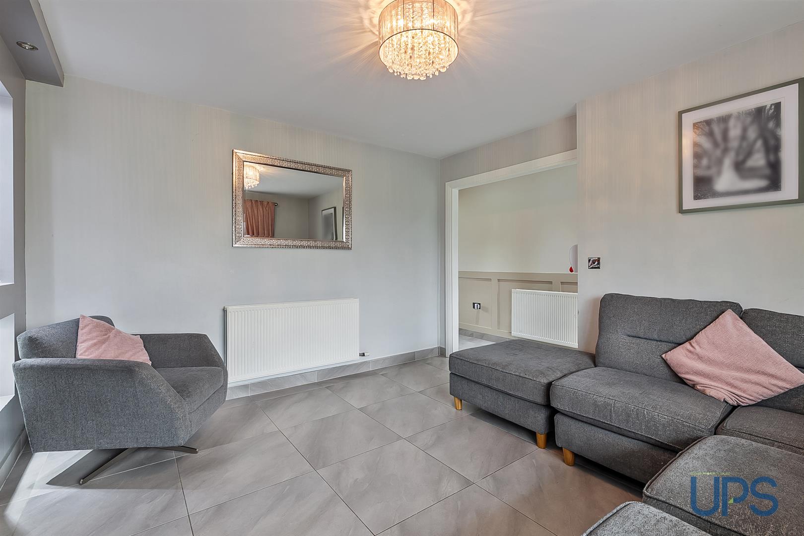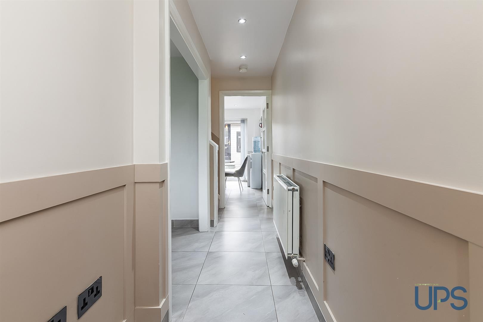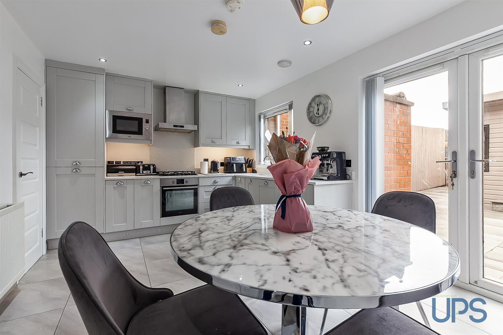 The ground floor features a welcoming entrance hall with tiled flooring and wood panelling, leading to a bright living room with spotlights and a feature media wall. The luxury kitchen flows seamlessly into a generous dining and entertaining area, with UPVC double-glazed double doors opening to an enclosed, low-maintenance garden.