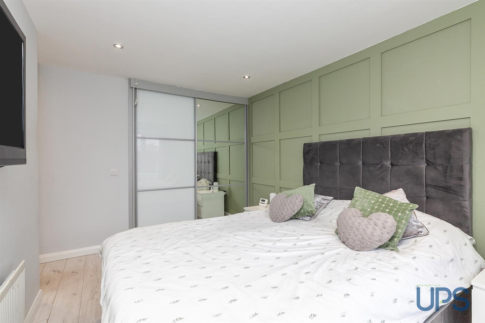 Wood-effect stripped flooring, spotlights, and contemporary built-in sliding wardrobes.