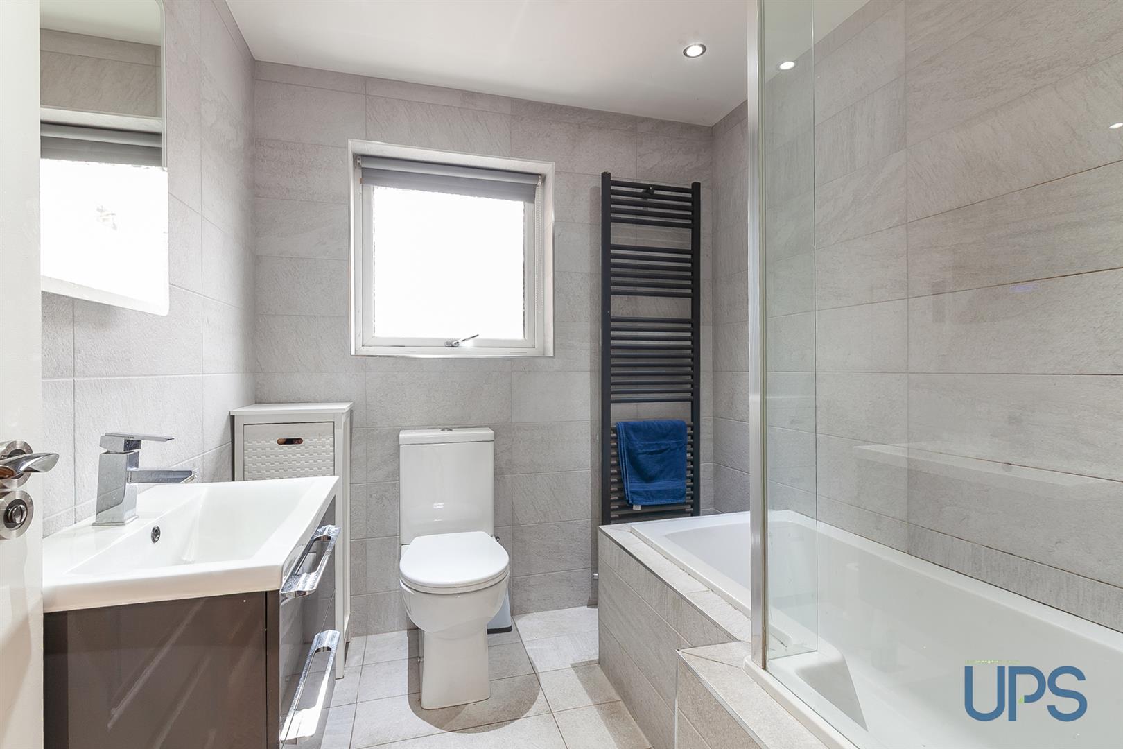 Tiled panelled bath with thermostatically controlled shower, low-flush WC, wall-hung wash hand basin, chrome-effect sanitary ware, towel warmer, spotlights, and beautifully tiled walls and floor.