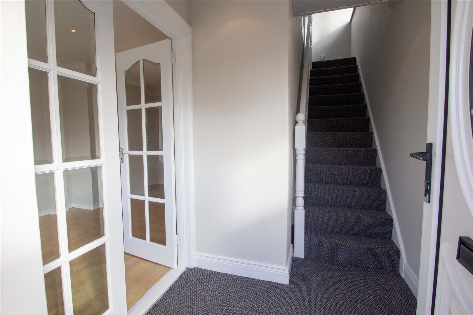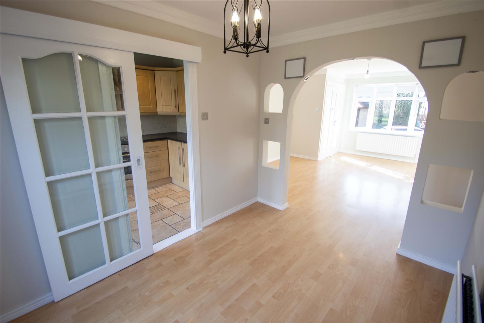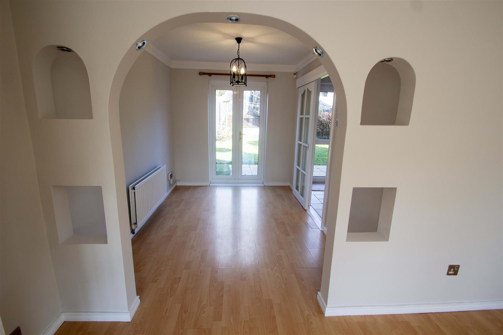 Wooden effect stripped floor, bay window, built-in storage, feature archway open plan to;