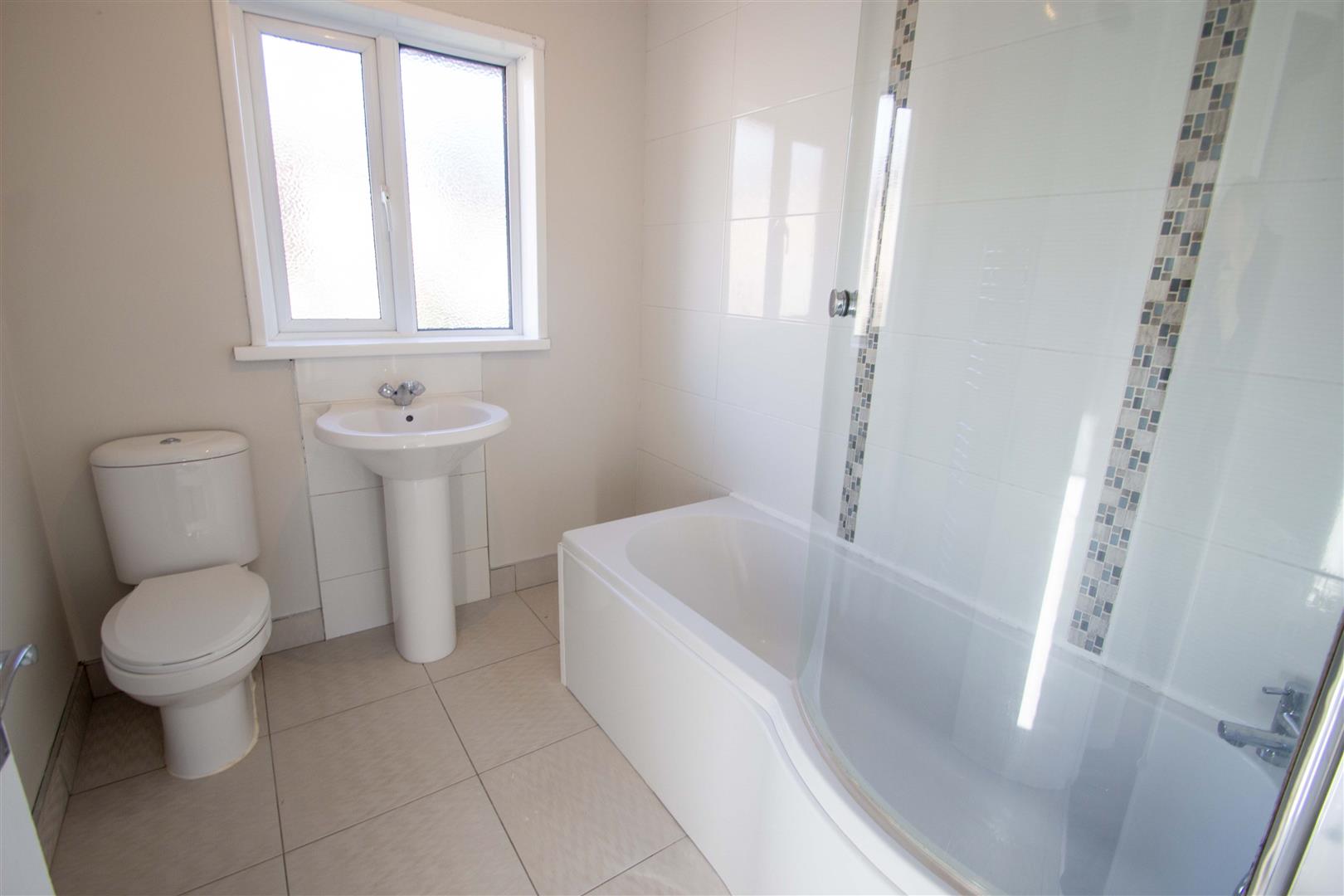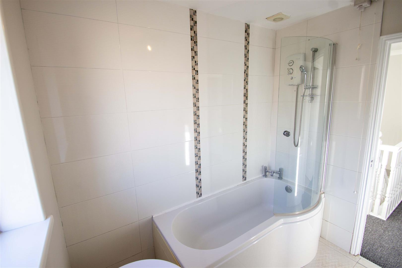 White bathroom suite. Paneled bath, feature shower, shower screen, wash hand basin, low flush W.c tiling. Chrome heated towel rail.