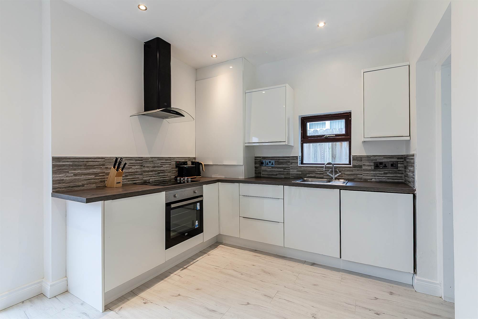 Built-in storage, laminate flooring. Range of high and low level units, single drainer stainless steel sink unit with mixer tap, four ring hob with extractor above, under oven, dishwasher spotlights, gas boiler.