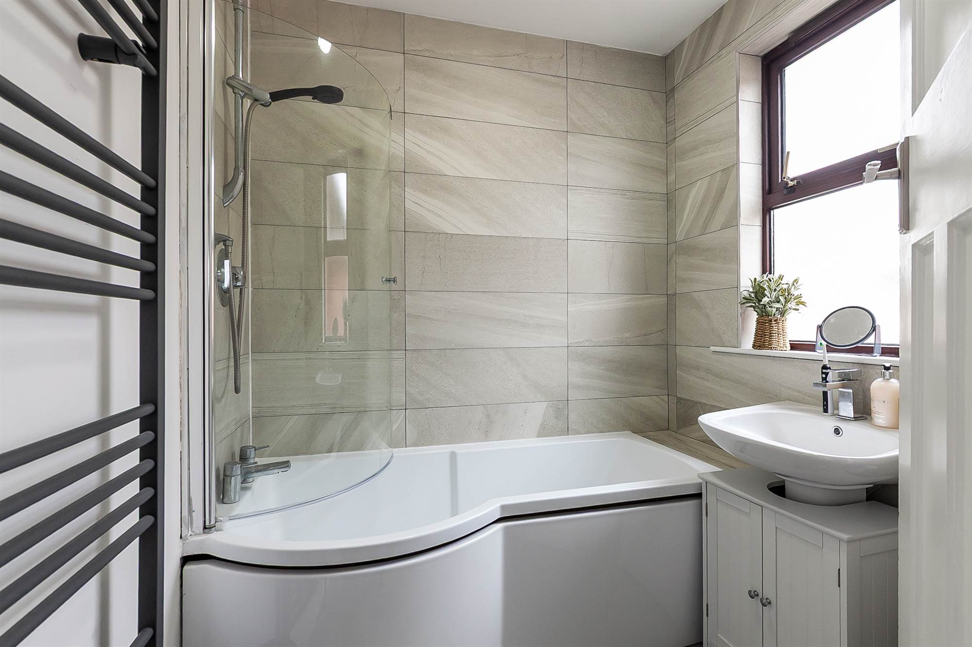 Panelled bath with mixer tap and shower over, pedestal wash hand basin, low flush wc, part tiled walls, heated towel rail, access to roofspace.