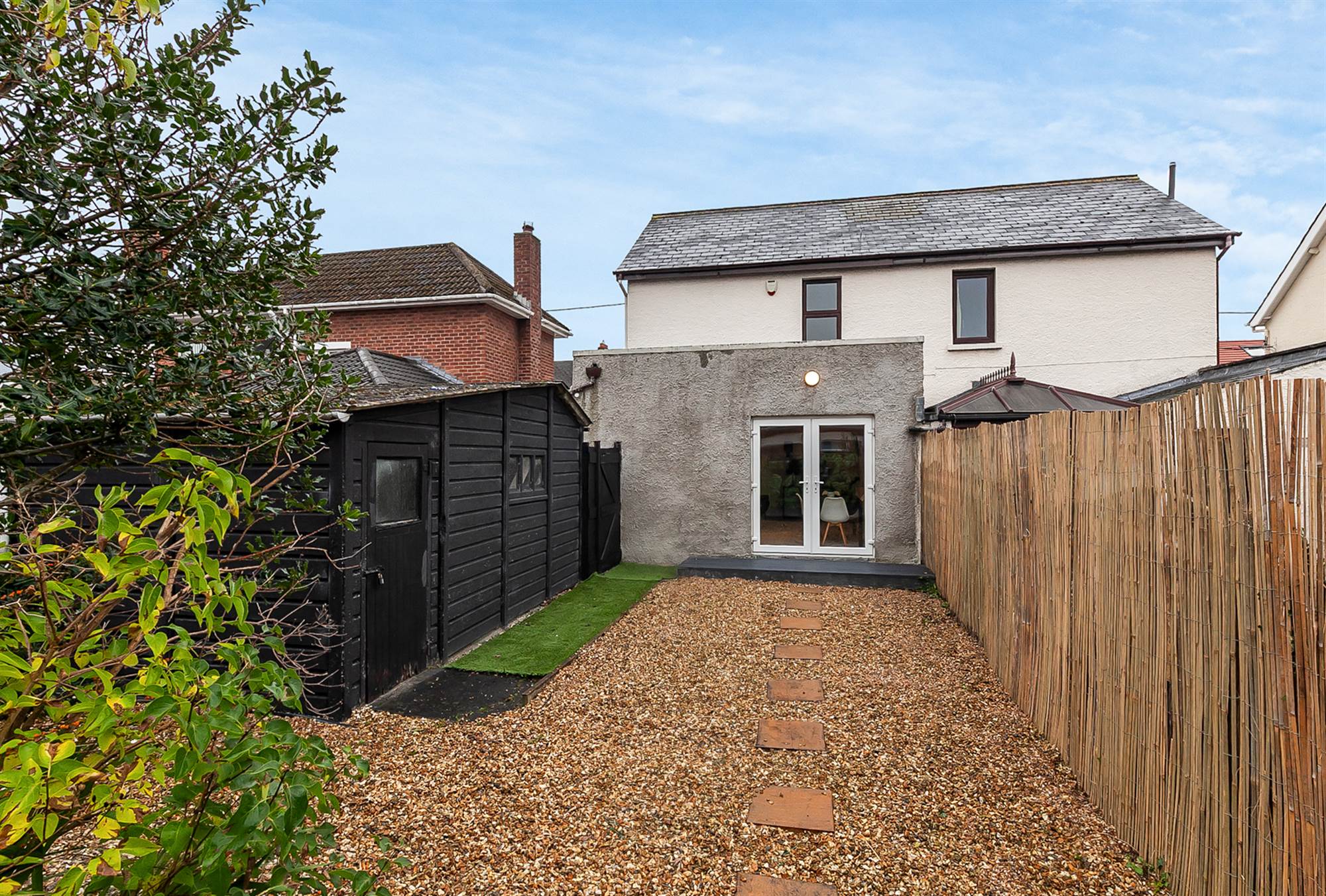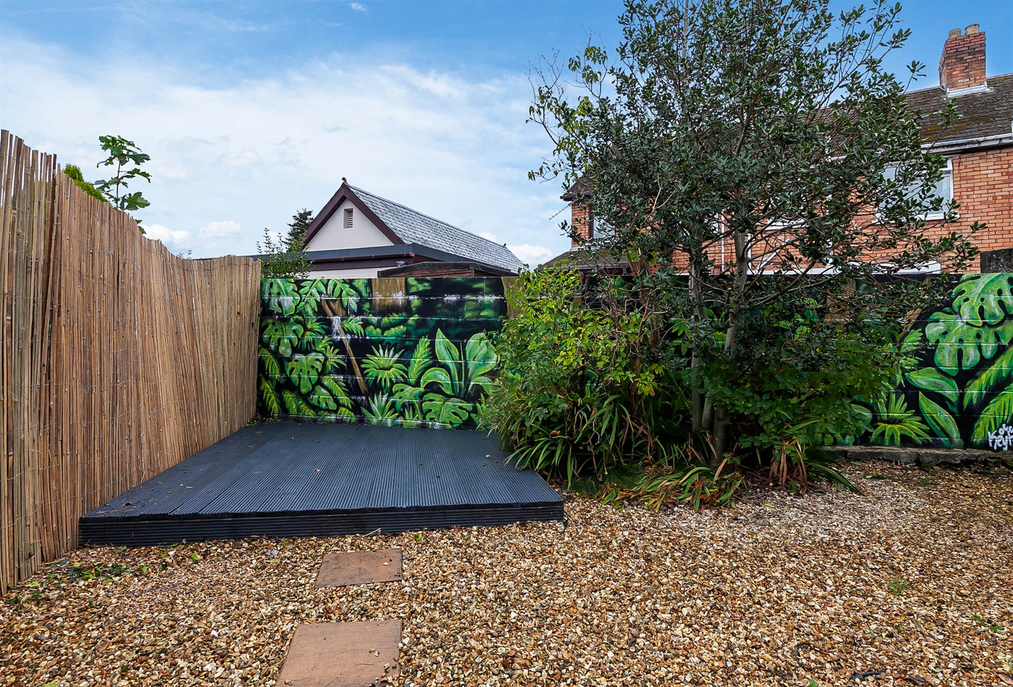Pebbled rear garden, raised deck area.