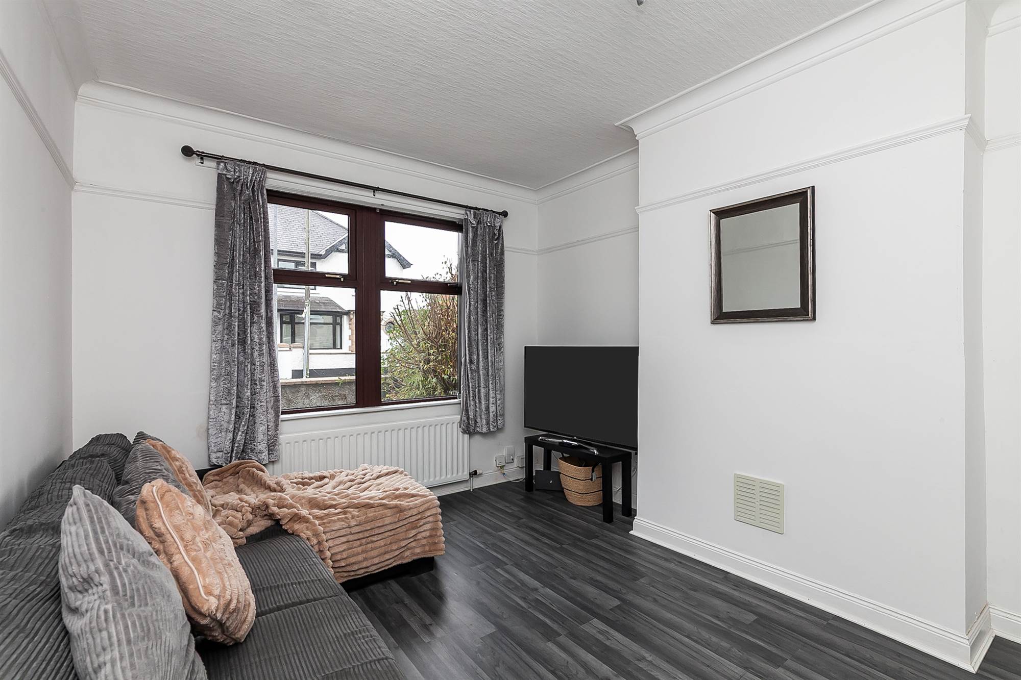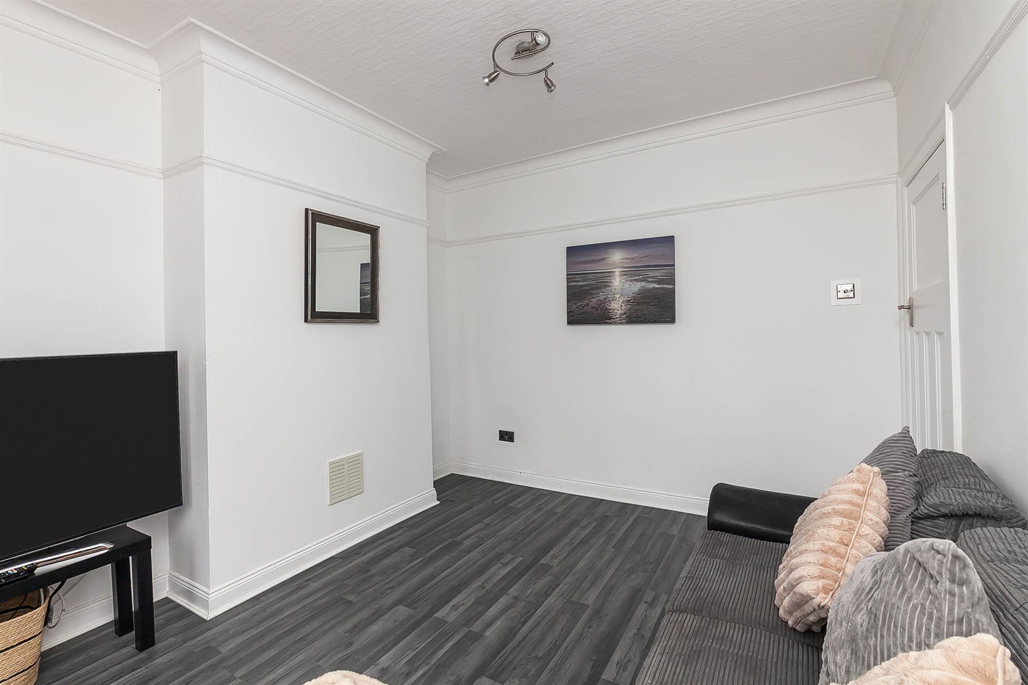 Picture rail, laminate flooring.