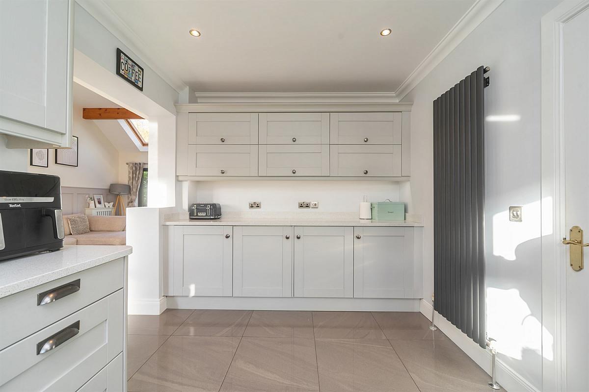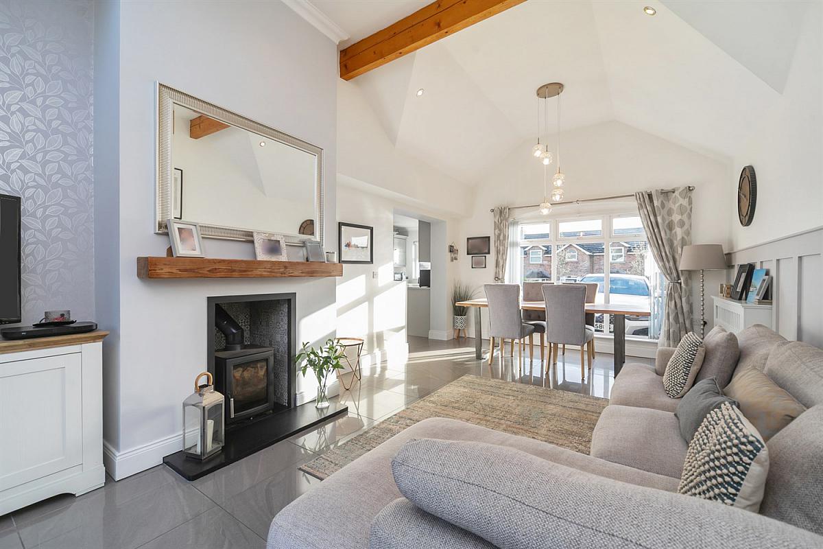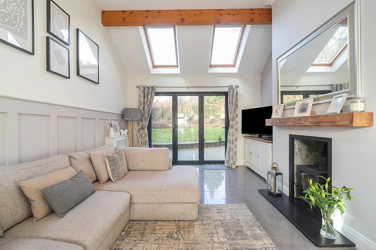 Vaulted ceiling with beams. Feature panel wall. Multi-fuel burner with tiled inset and wooden mantle above. Porcelain tiled floor. x2 Velux windows.