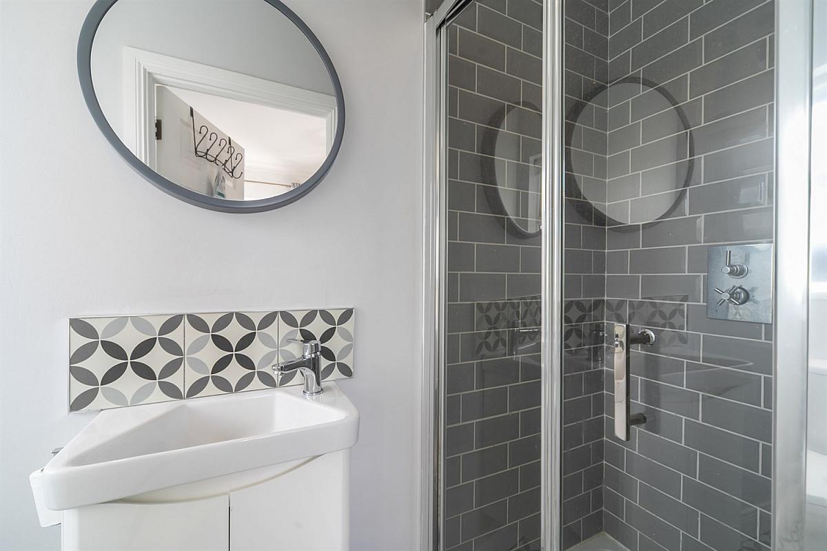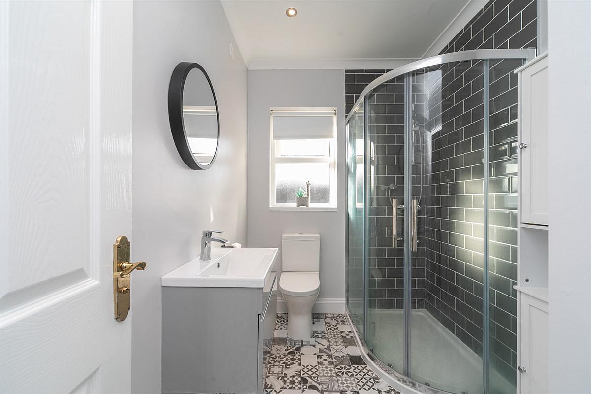Fully tiled corner shower enclosure, low flush W.C, vanity unit, cornice ceiling, feature tiled floor.