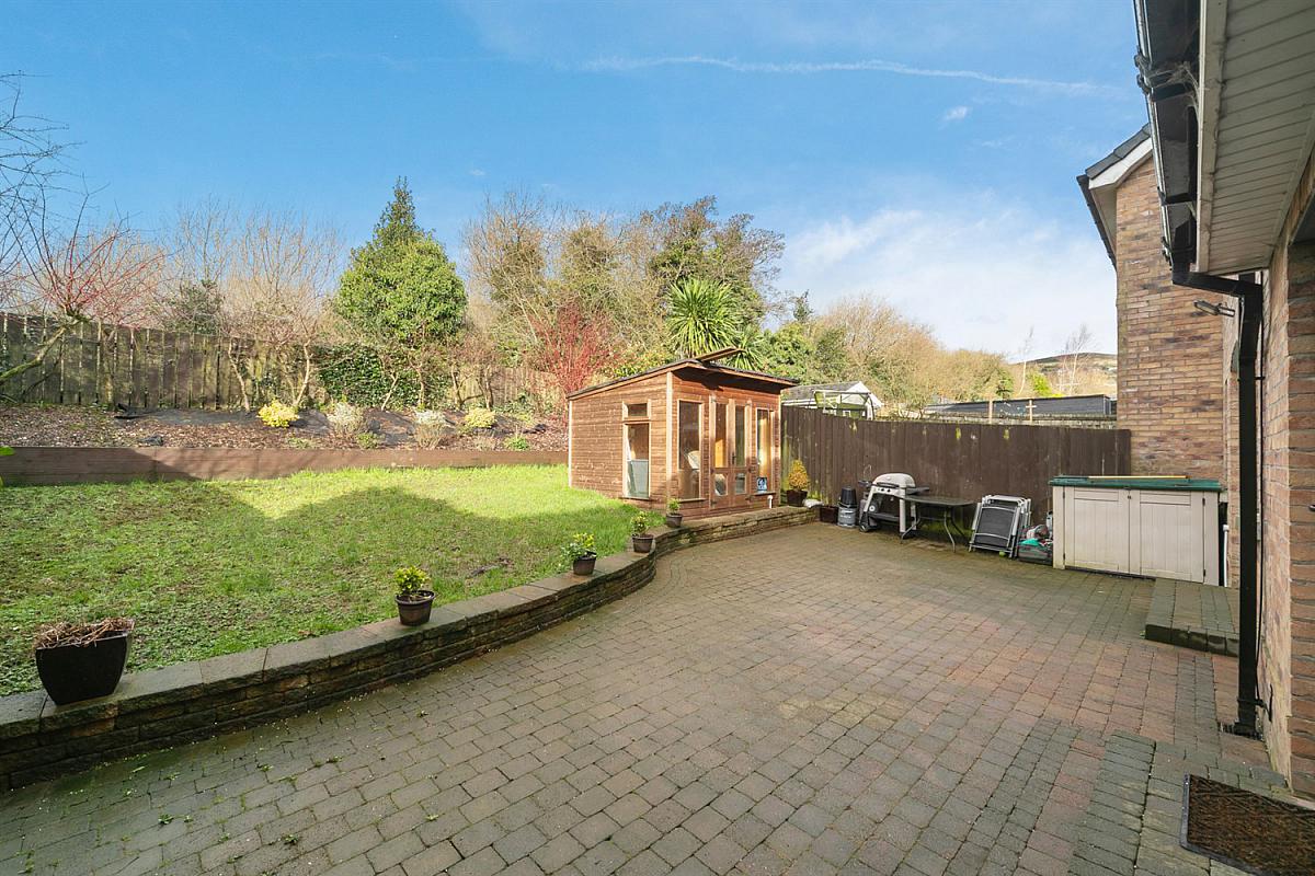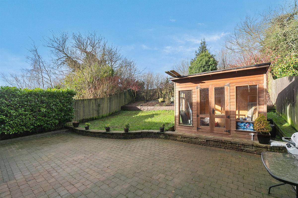Enclosed and private South West facing rear garden, extensive paved patio area, lawns with raised flower beds, boundary fencing and hedging. Side bin area. Garden shed.