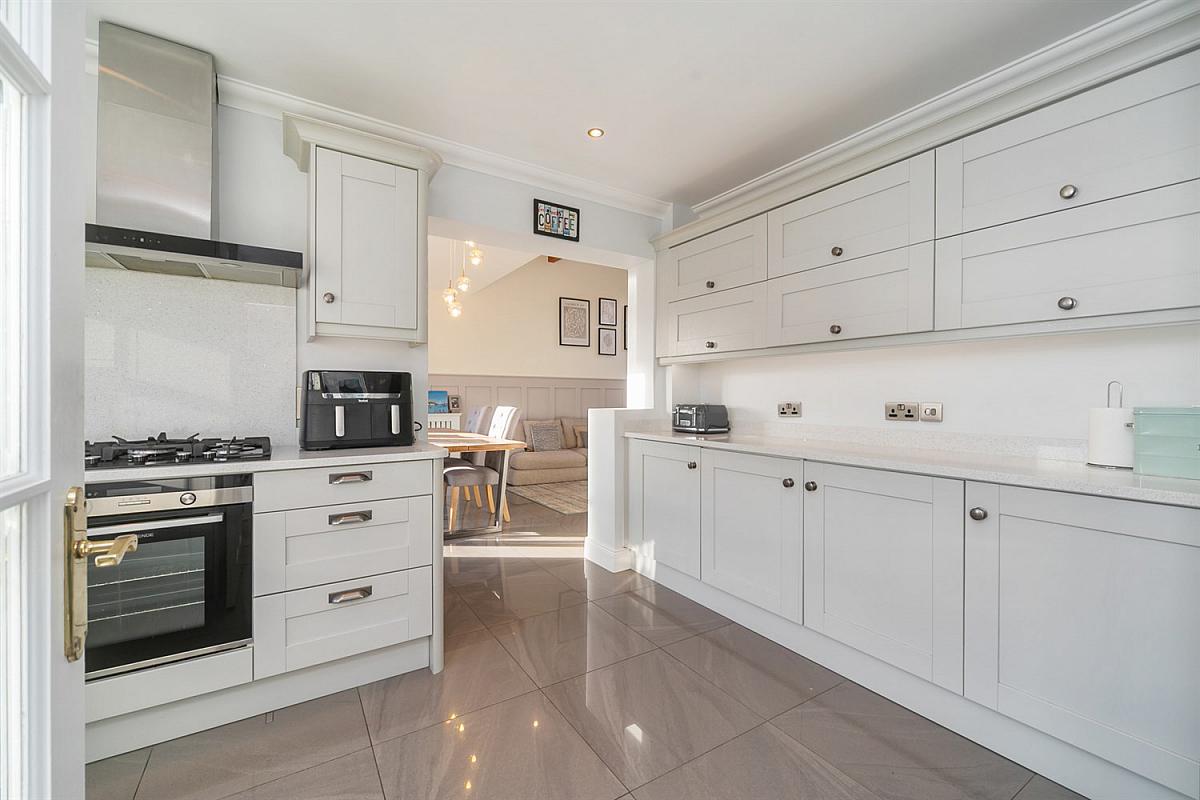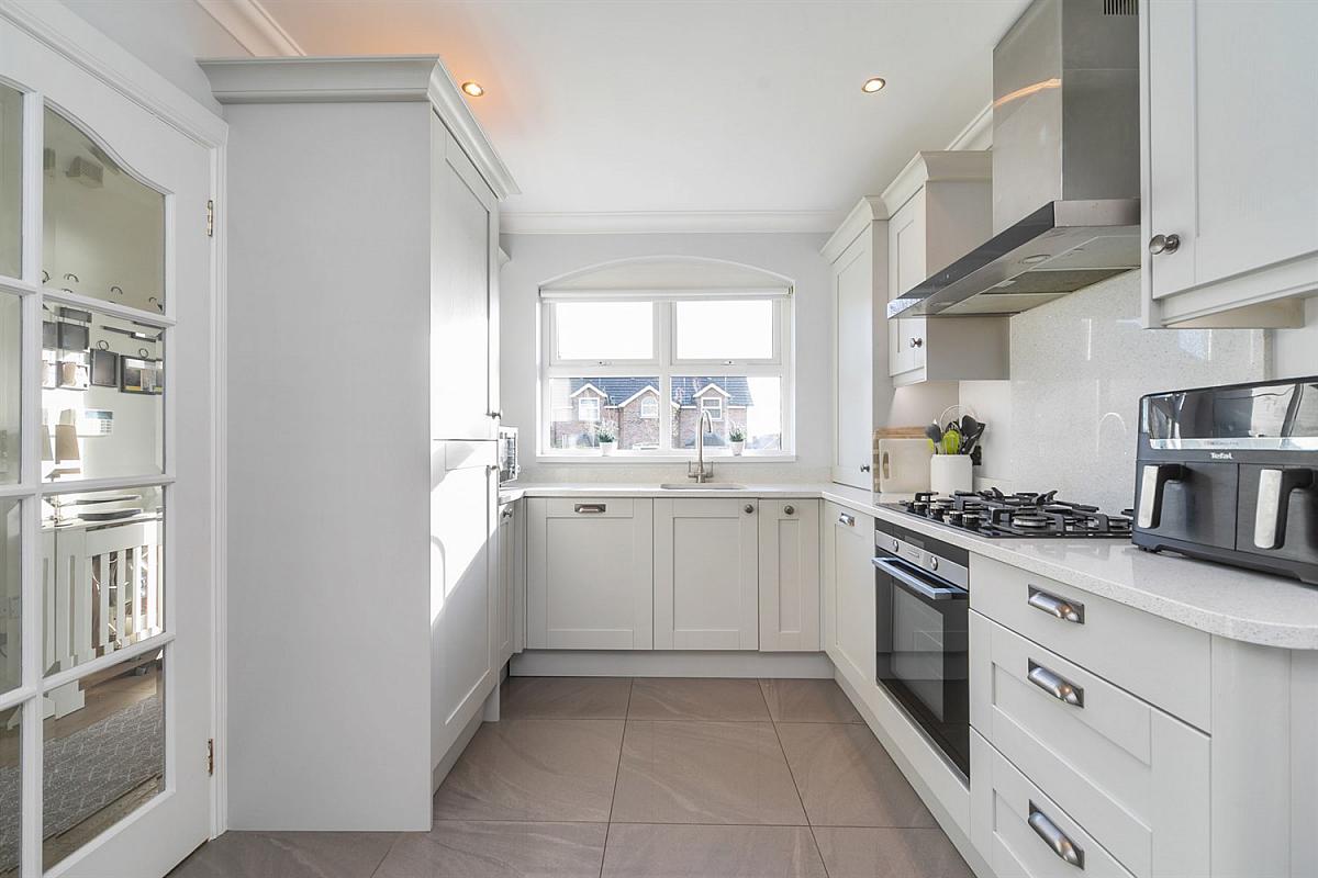 Full range of high and low level units, speckled white granite worktop, 'Blanco' stainless steel sink, integrated dishwasher, integrated fridge freezer, stainless steel electric oven, 5 ring gas hob, stainless steel extractor hood. Integrated washing machine and tumble dryer. Porcelain tiled floor. Cornice ceiling.