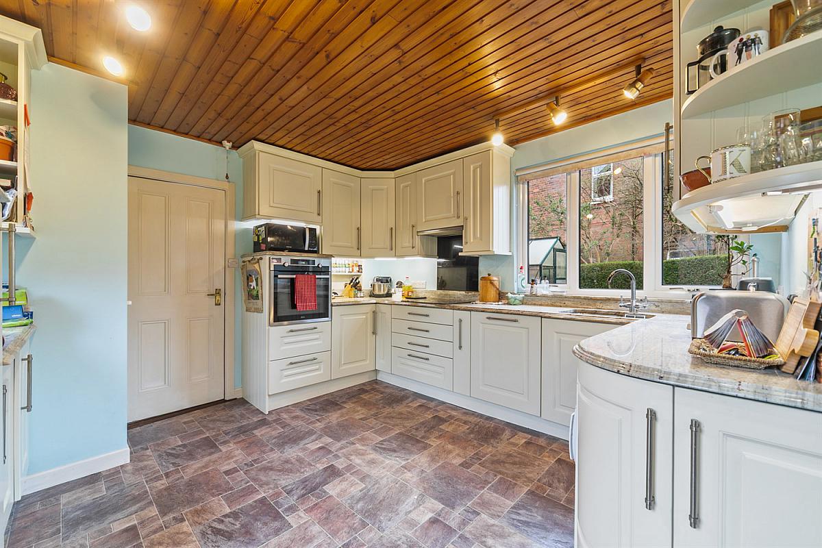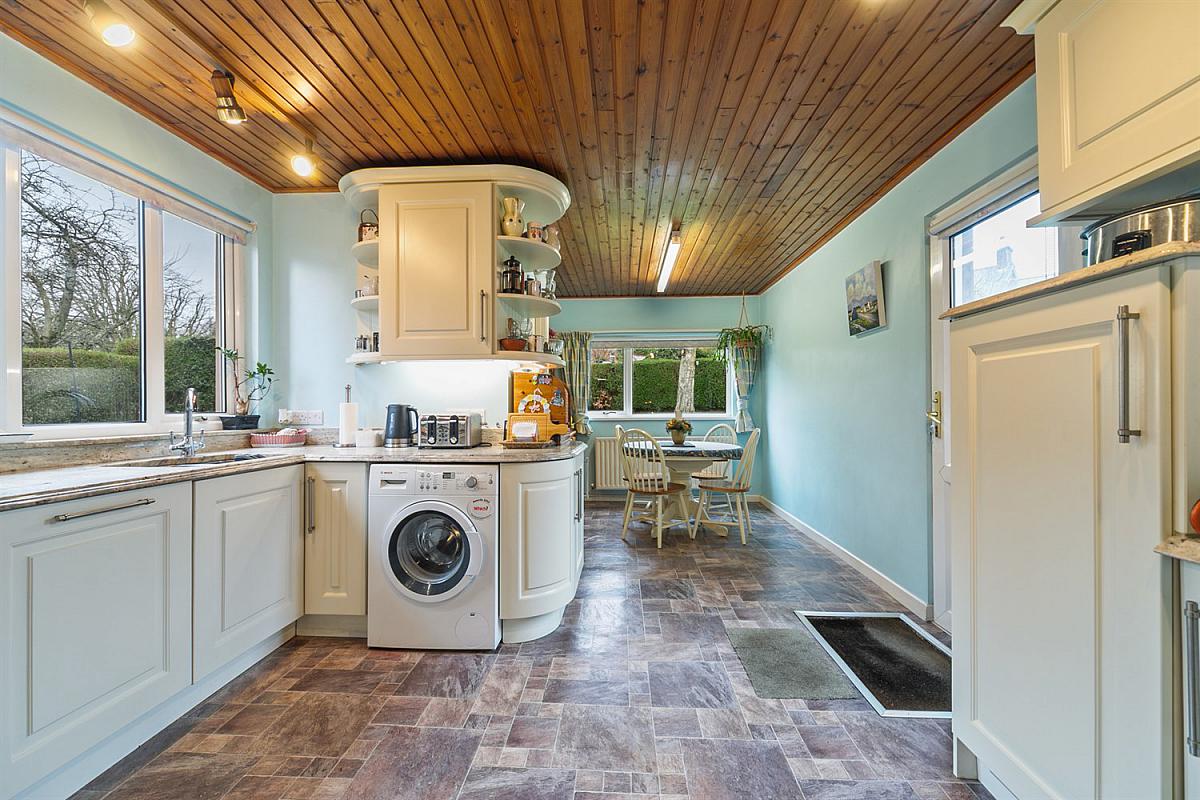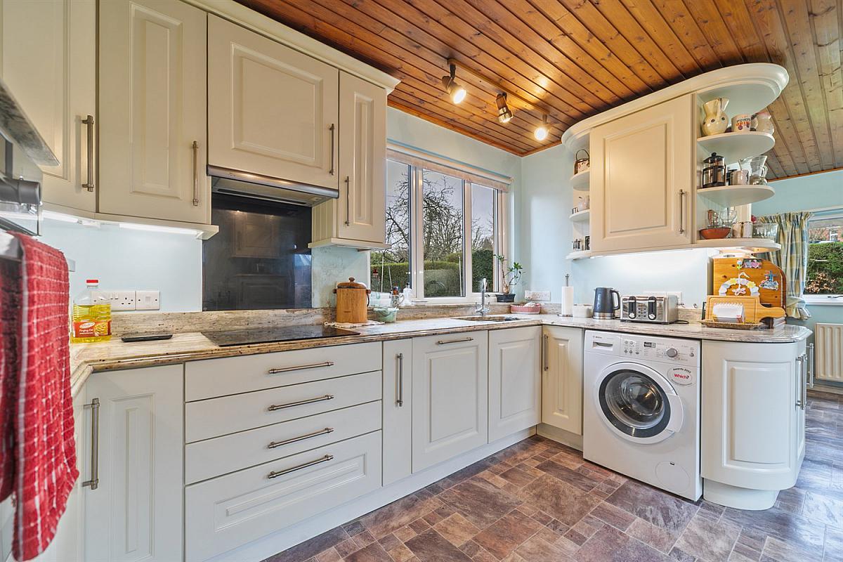 Full range of high and low level units, marble worktop, 1½ single drainer stainless steel sink unit, four ring ceramic hob, extractor hood, integrated fridge, stainless steel oven, integrated 'Bosch' dishwasher, plumbed for washing machine, tongue and groove panelled ceiling. Door to garden.