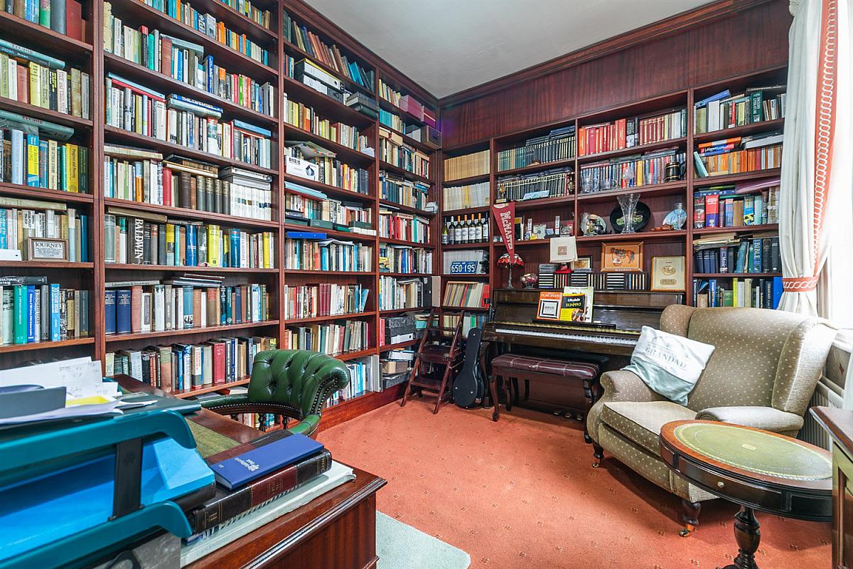 Wall to wall built in bookshelves.