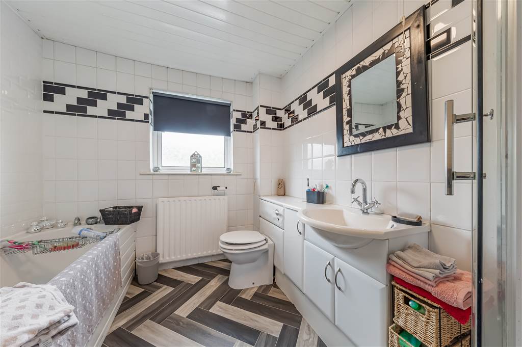 White suite comprising of panelled bath, low flush w.c, wash hand basin with mixer taps and vanity unit, shower enclosure, partly tiled walls, panelled radiator.