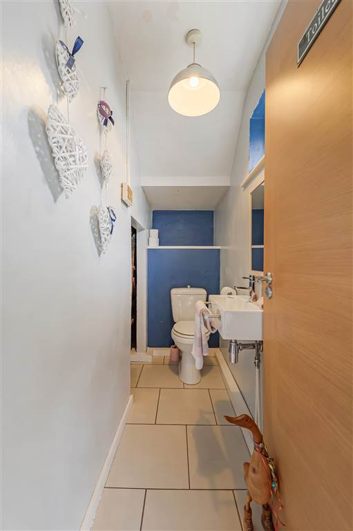Low flush W.C, 1/2 pedestal wash hand basin with mixer taps, ceramic tile flooring, understair storage unit.