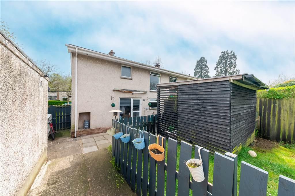 Paved patio area, laid in lawn, outside tap, outside socket & light.