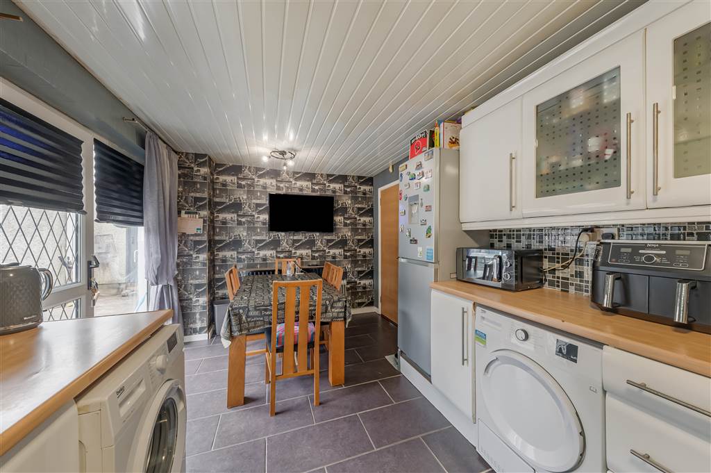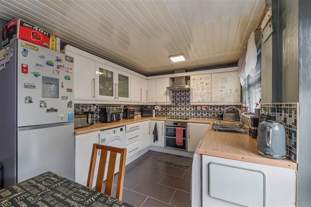 Range of high and low level units, formica work surfaces, stainless steel sink unit, 4 ring ceramic hob and electric oven, stainless steel extractor fan, plumbed for washing machine, fridge freezer space, tumble dryer space, partly tiled walls, ceramic tile flooring, dining room, double panelled radiator.