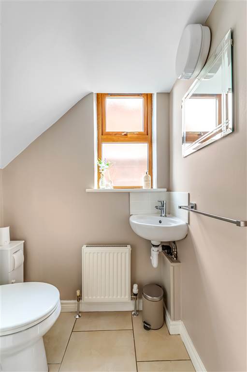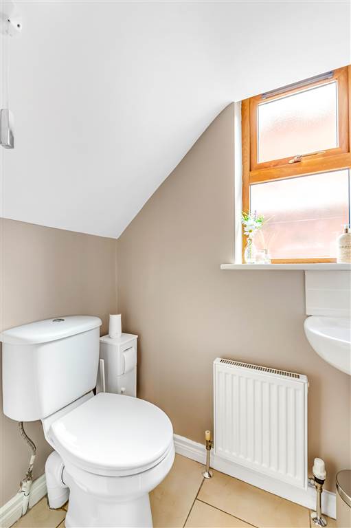 White suite comprising of low flush W.C, sink unit with mixer taps, partly tiled walls, ceramic tiled flooring, panelled radiator.
