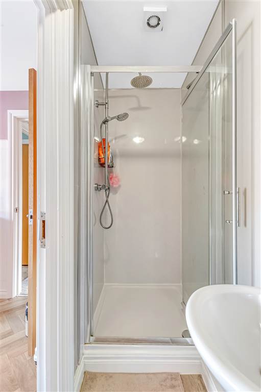 White suite comprising of panelled bath with bath / shower mixer taps, low flush W.C, pedestal wash hand basin with mixer taps & vanity unit, chrome towel radiator, partly tiled walls, extractor fan.