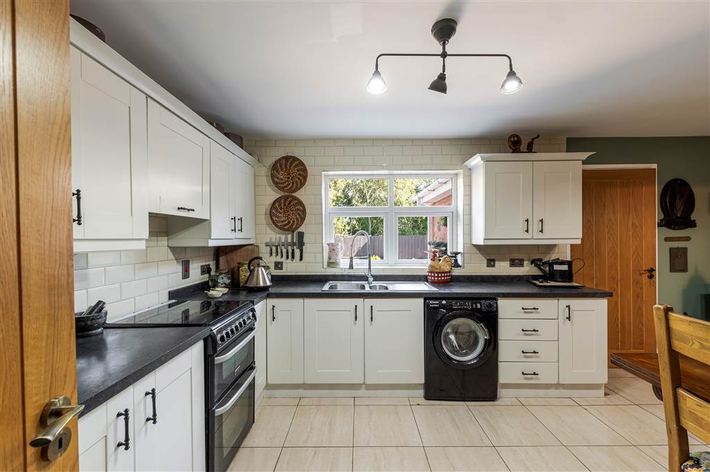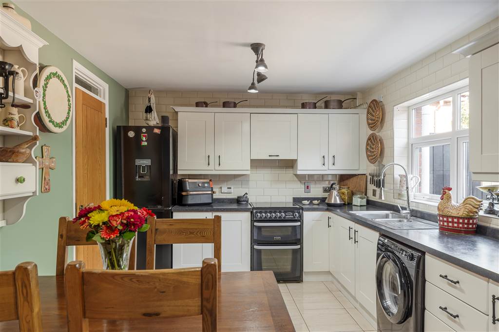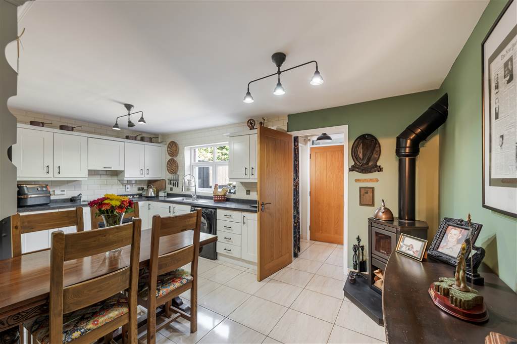 Excellent range of high and low level units, formica work surfaces, stainless steel sink unit with mixer taps, fridge freezer space, cooker space, plumbed for washing machine, feature stove, partly tiled walls, ceramic tile flooring, double panelled radiator, feature stove, storage cupboard.