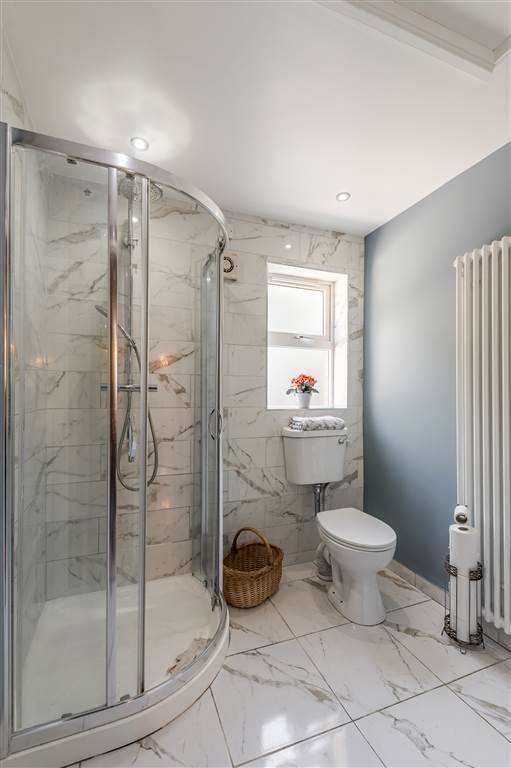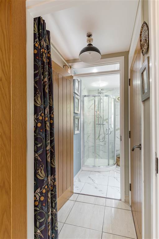 White suite comprising of shower enclosure, hand wash basin with mixer taps, low flush w.c, ceramic tile flooring, partly tiled walls, recessed spotlight, extractor fan.