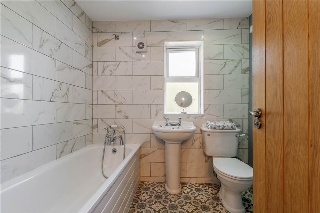 White suite comprising of panelled bath with mixer taps, low flush w.c, wash hand basin with mixer taps, ceramic tile flooring, recess spotlight.
