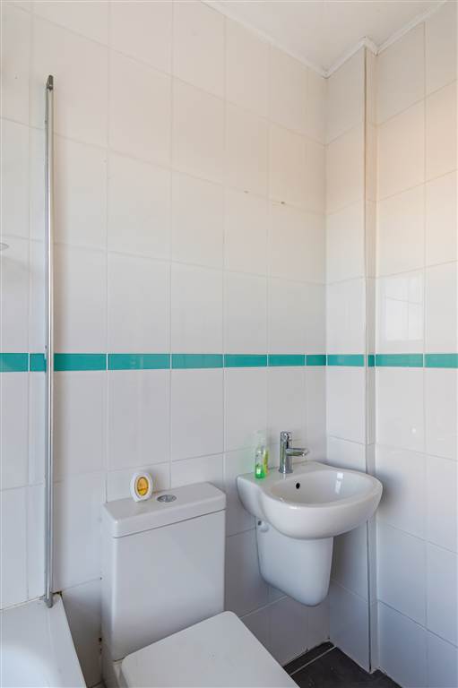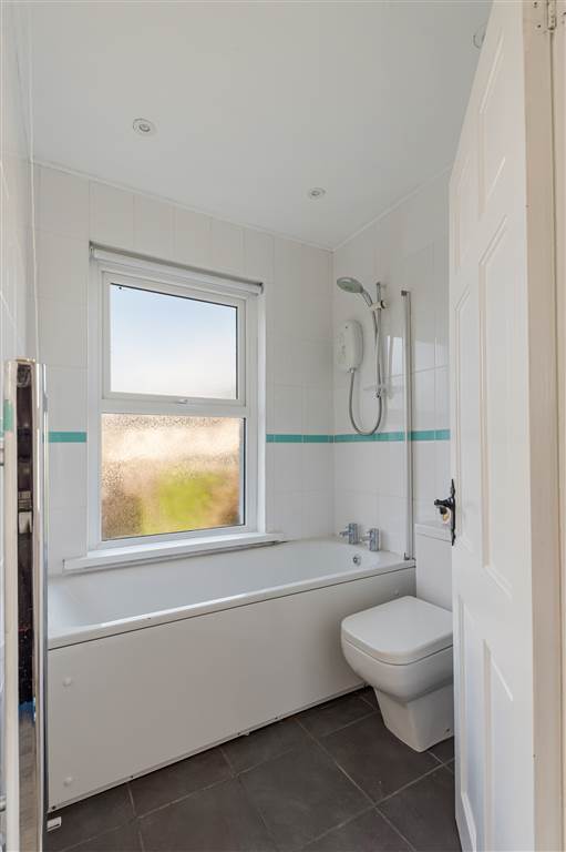 White suite comprising of of panelled bath with electric shower, low flush w.c, 1/2 pedestal wash hand basin with mixer taps, recessed spotlighting, fully tiled walls, ceramic tile flooring, chrome towel rail.