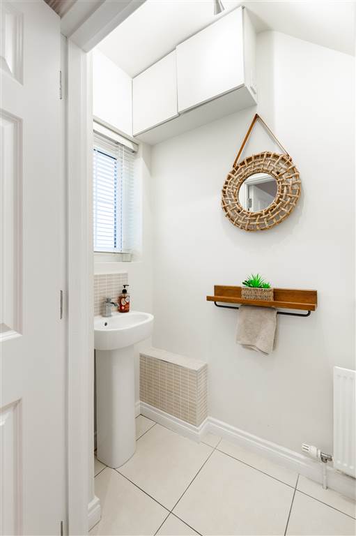 White suite comprising of low flush W.C, pedestal wash hand basin with mixer taps, partly tiled walls, ceramic tiled flooring, extractor fan, panelled radiator.