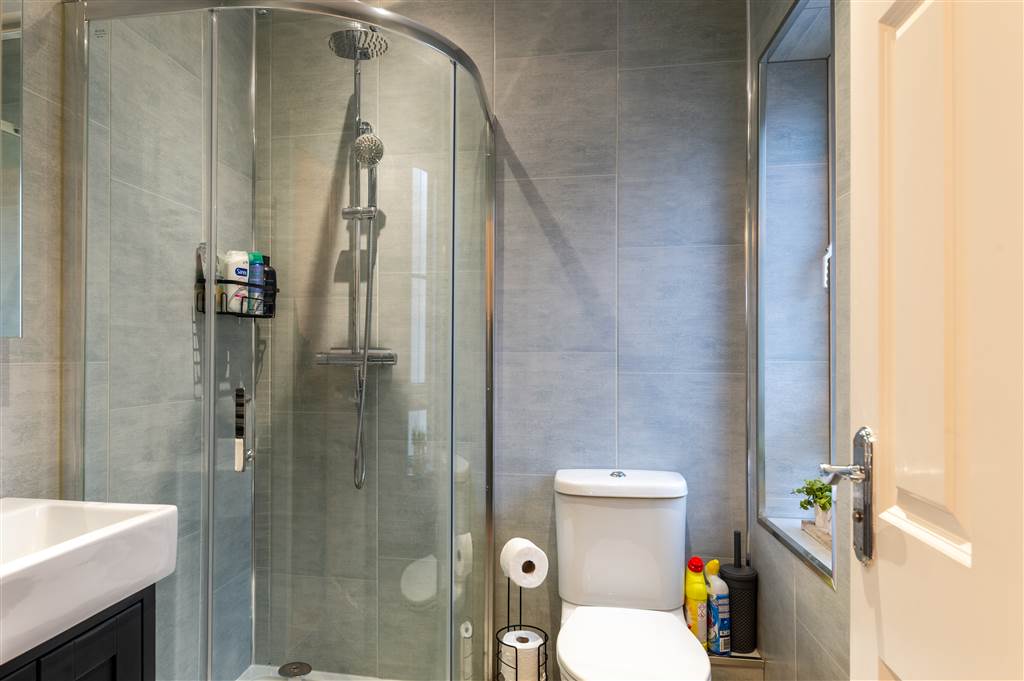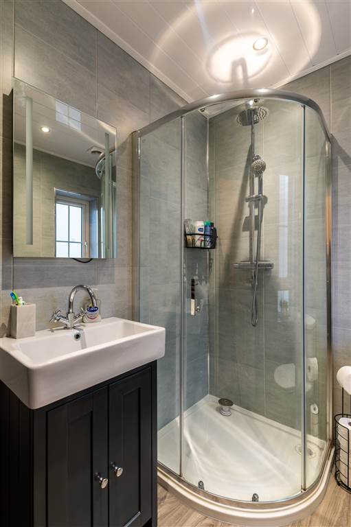 White suite comprising of shower enclosure with Waterfall shower head, wash hand basin with mixer taps & vanity unit, low flush W.C, feature mirror with lighting, wall mounted radiator, PVC panelled walls.