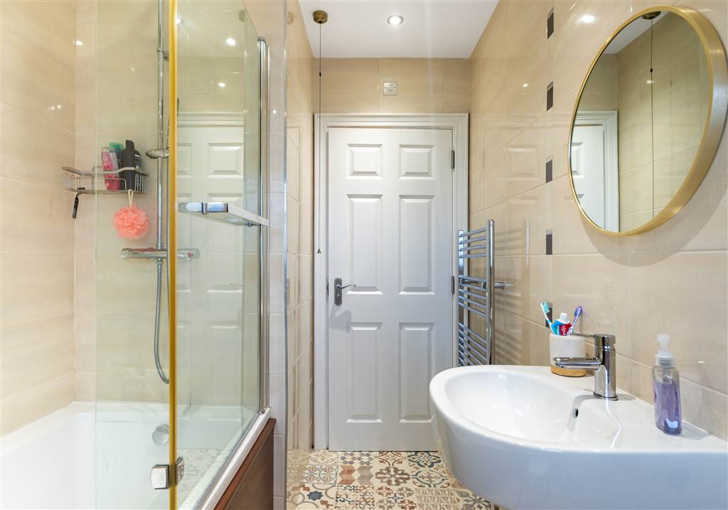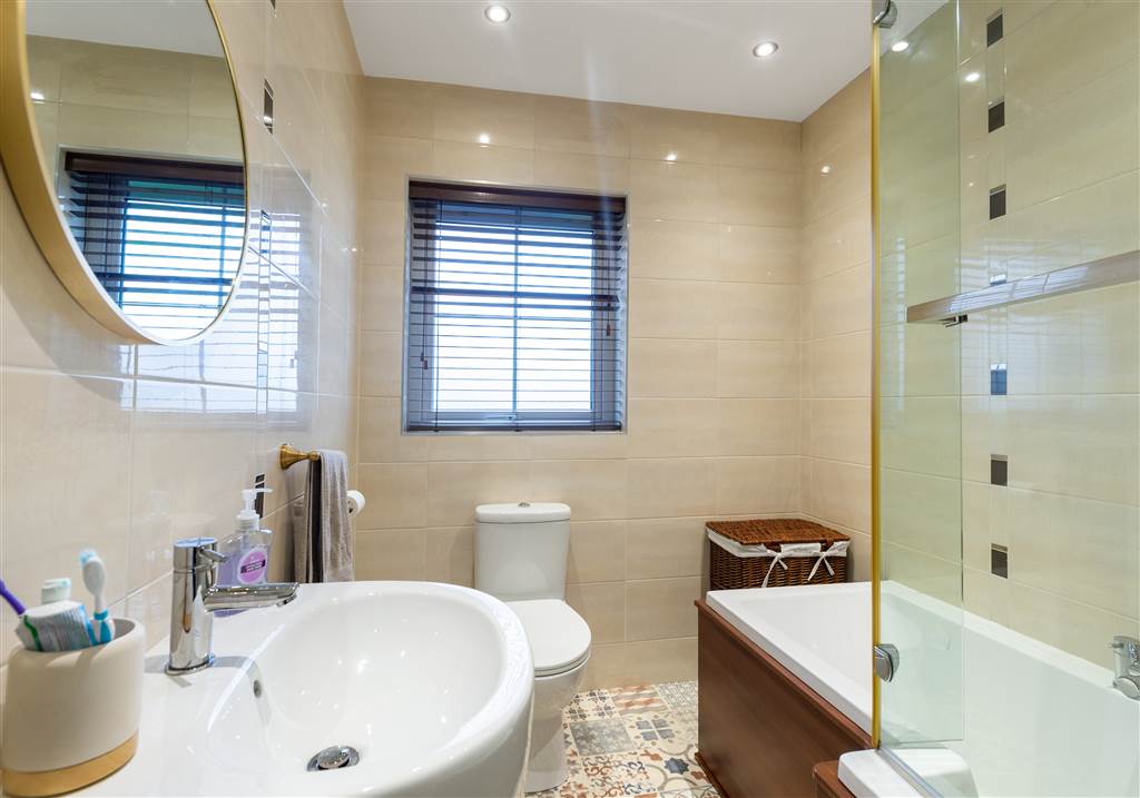 White suite comprising of panelled bath with mixer taps, waterfall shower head, 1/2 pedestal wash hand basin with mixer taps, low flush W.C, fully tiled walls, laminate wood flooring, recessed spot lighting, extractor fan, chrome towel radiator.