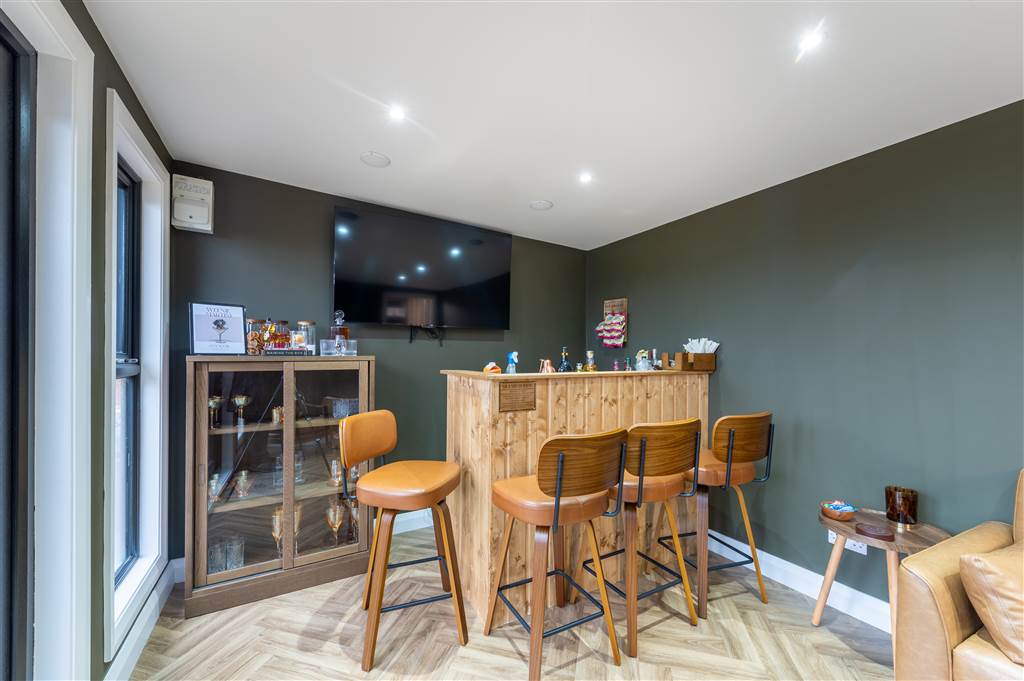 Exceptional recently installed bar, with feature drinks counter, recessed spot lighting, surround sound. Leads to: Utility space, range of units, tumble dryer space, fridge / freezer space.