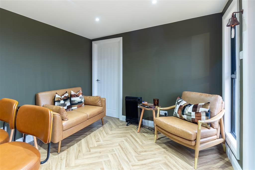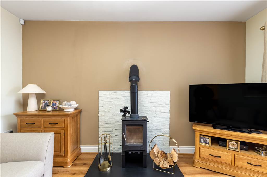 Laminate wood floroing, feature multi fuel stove, with slate hearth and feature tired surround, panelled radiator.